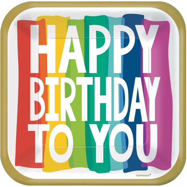 You may be interested in these similar products shown below.Happy Birthday Rainbow Square Plates feature a bold gold border and a "Happy Birthday To You" headline printed onto a rainbow stripe background