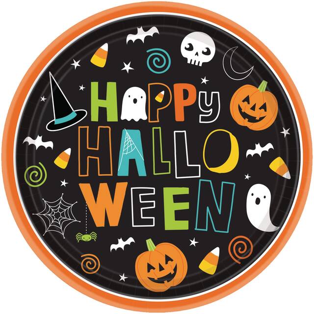 Features a colourful "Happy Halloween" headline against a black background surrounded by ghosts, candy corn, jack-o'-lanterns, and other Halloween-themed designs