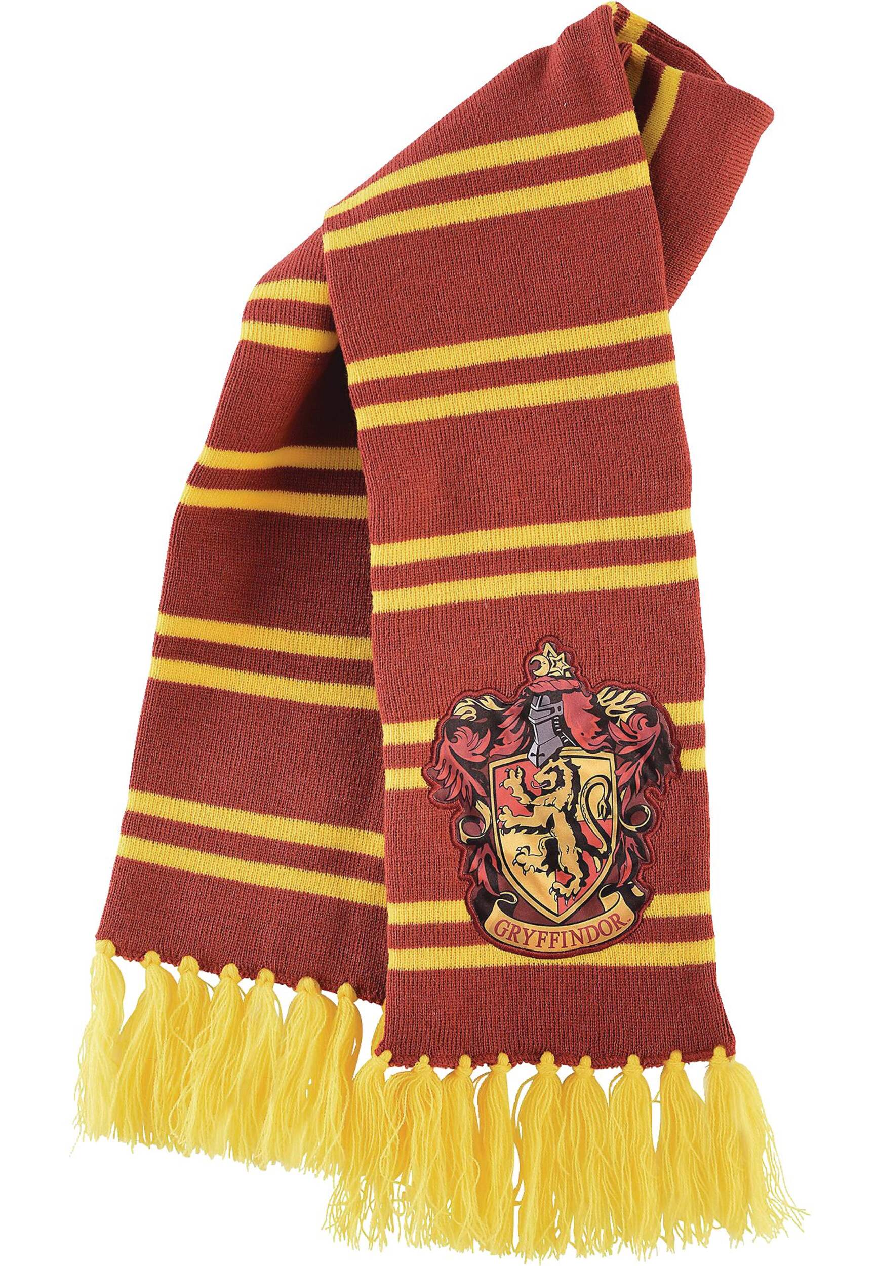 Stay warm during magical adventures in this Harry Potter Gryffindor Scarf! This red and yellow striped knit scarf features the Gryffindor house crest patch and has a yellow tassel hem. Use this Gryffindor Scarf as part of a Harry Potter Halloween costume or for every day wear!