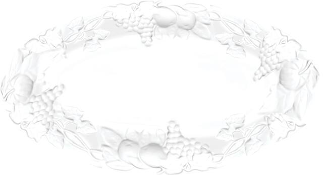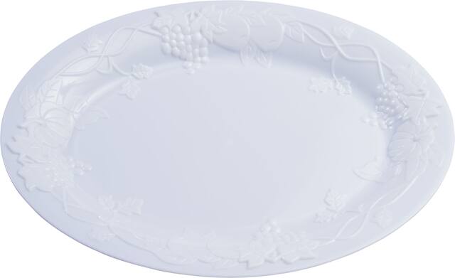 Molded grape pumpkin plum and leafy vine designs decorate the rim for a seasonal look that's perfect for fall and Thanksgiving parties