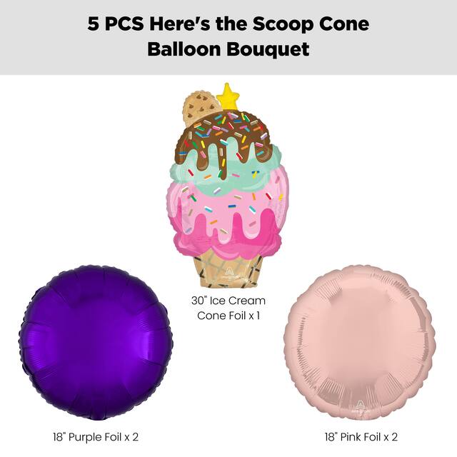 This kit includes: 1 Here's the Scoop Cone 30" Supershape Balloon, 2 18" Purple Round Foil Balloons (SKU 8423911) and 2 18" Pastel Pink Round Foil Balloons (SKU 8432006)