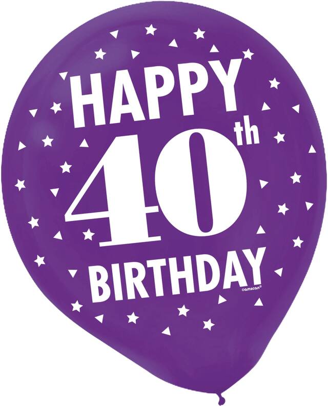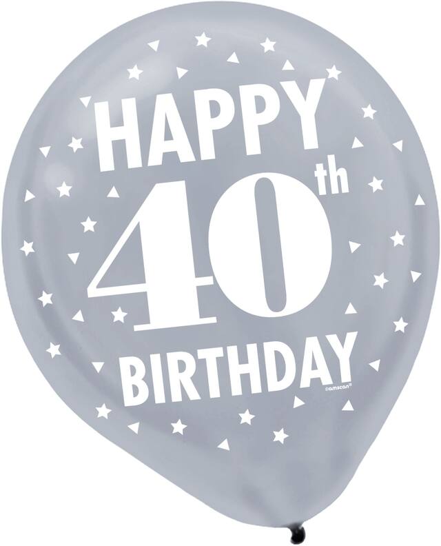 Featuring a "Happy 40th Birthday" message, these latex balloons come in grey, green, purple, red, and yellow