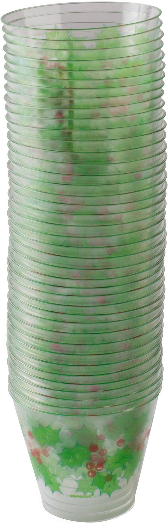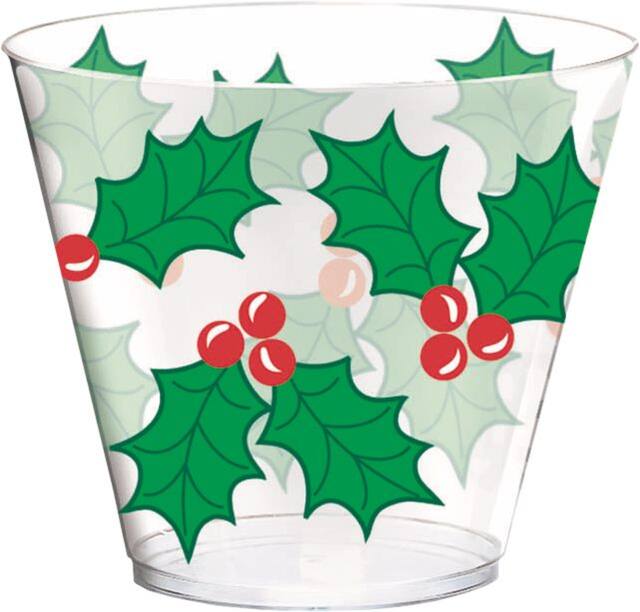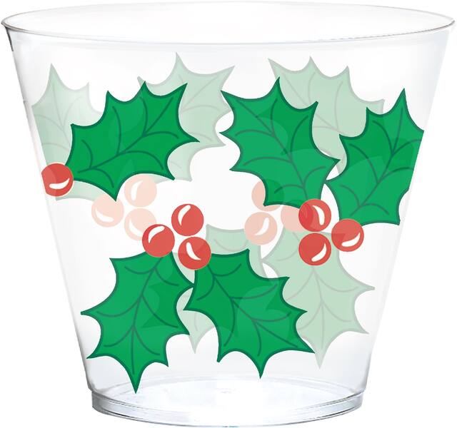 With an all-over holly print, these clear plastic cups are great for holiday beverages