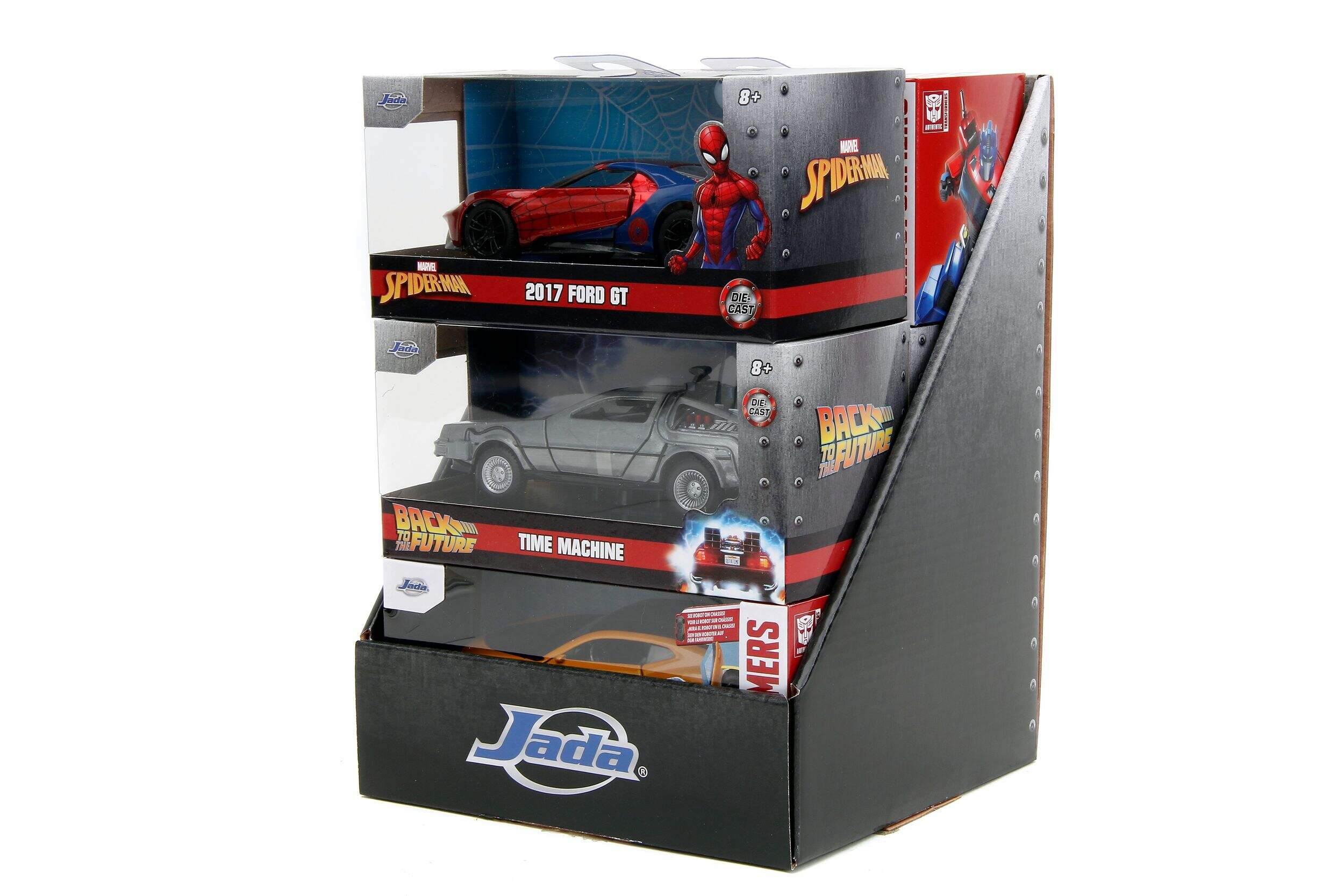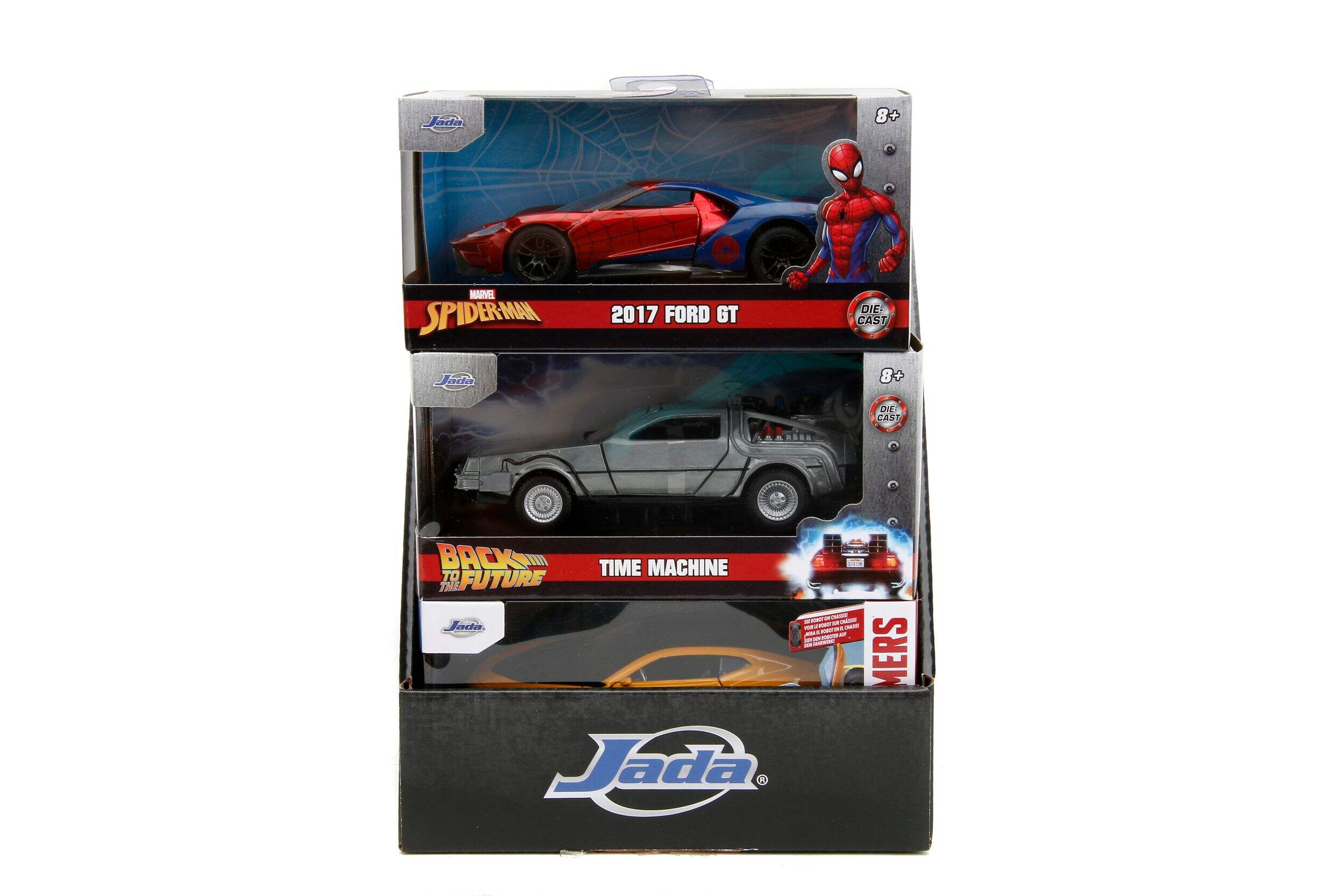Each package includes cars from different movies such as Spiderman, Back to the Future, Transformers, and more