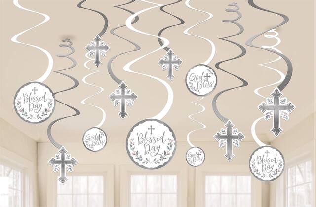 Silver Cross Holy Day Swirl Decorations feature attached cardstock cut-outs with trefoil crosses or headlines like God Bless and Blessed Day