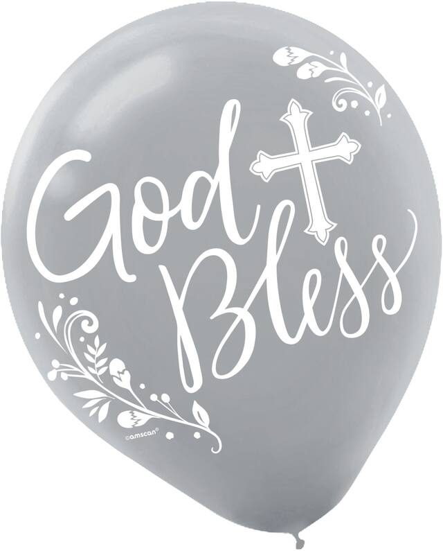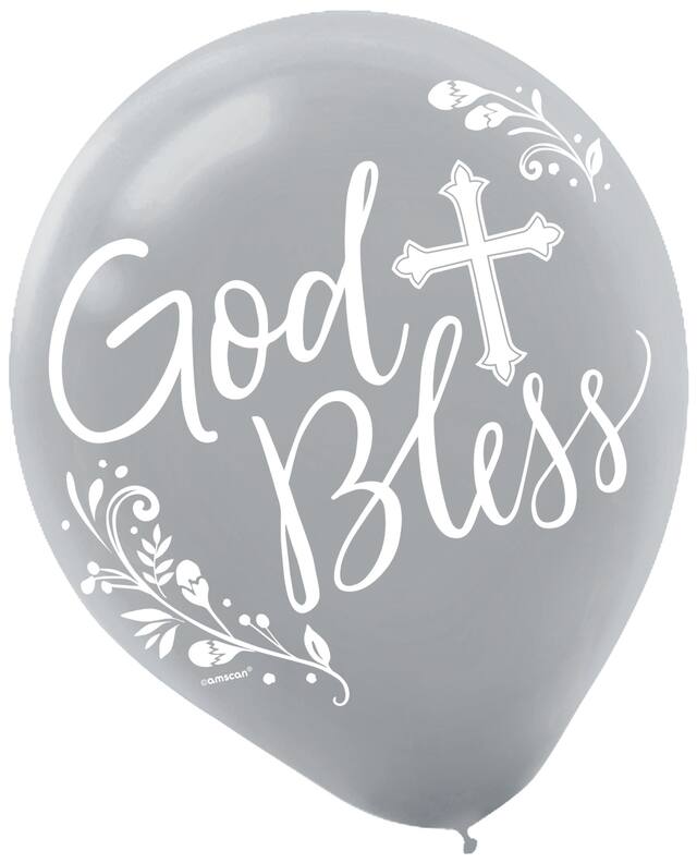 White and silver balloons provide a subtle, elegant way to decorate for any special occasion. This 15 pack of latex balloons features two neutrally stylish designs - one printed with a "God bless" message and the other with a simple gray cross - that give a touch of festivity without shouting. Fill the room with these softly shaded balloons to set a quietly joyful tone at your communion celebration.