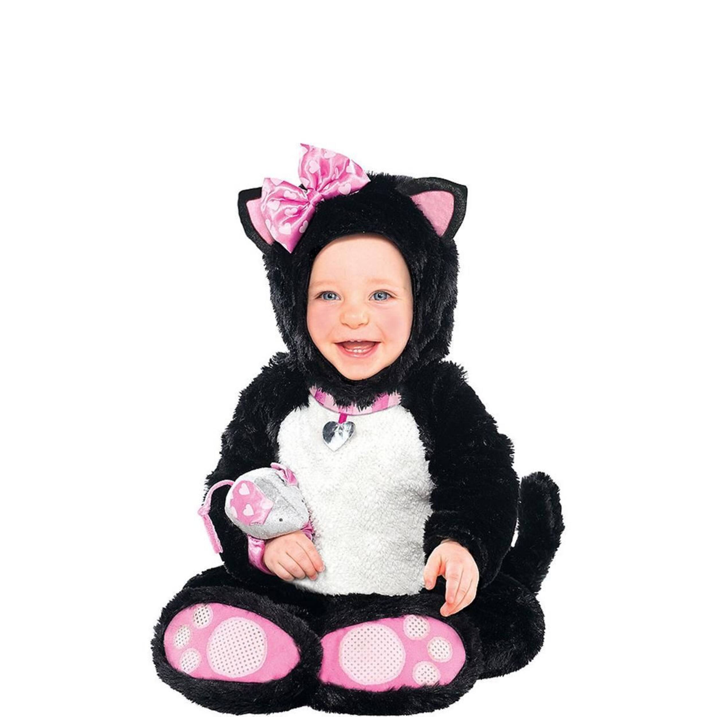 Baby Cat Itty Bitty Kitty Costume features a plush black and white jumpsuit with attached collar and tail and pink soles on the footies