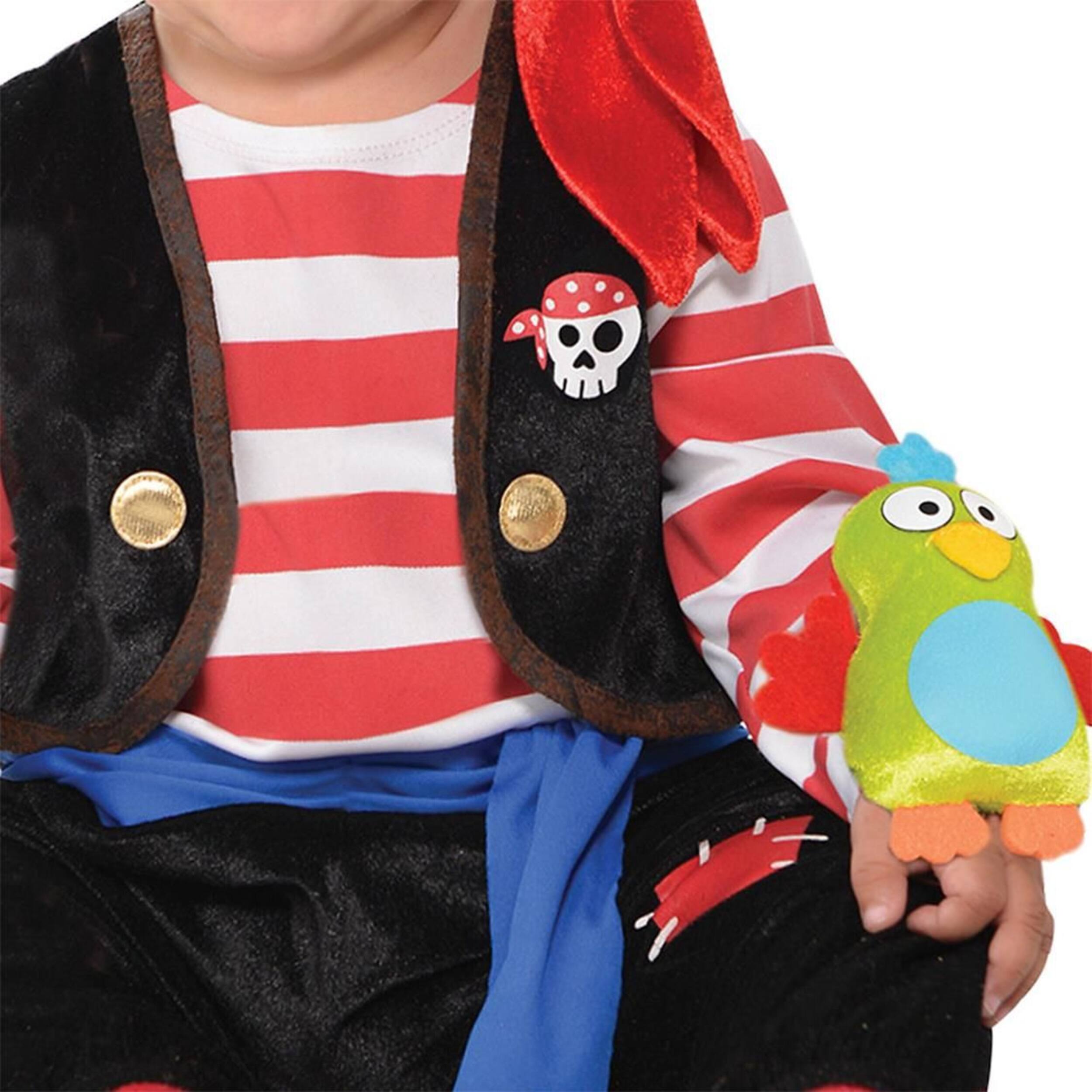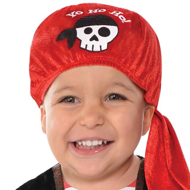 Baby's ready to rule the seven seas in the red elastic head wrap and plush parrot toy