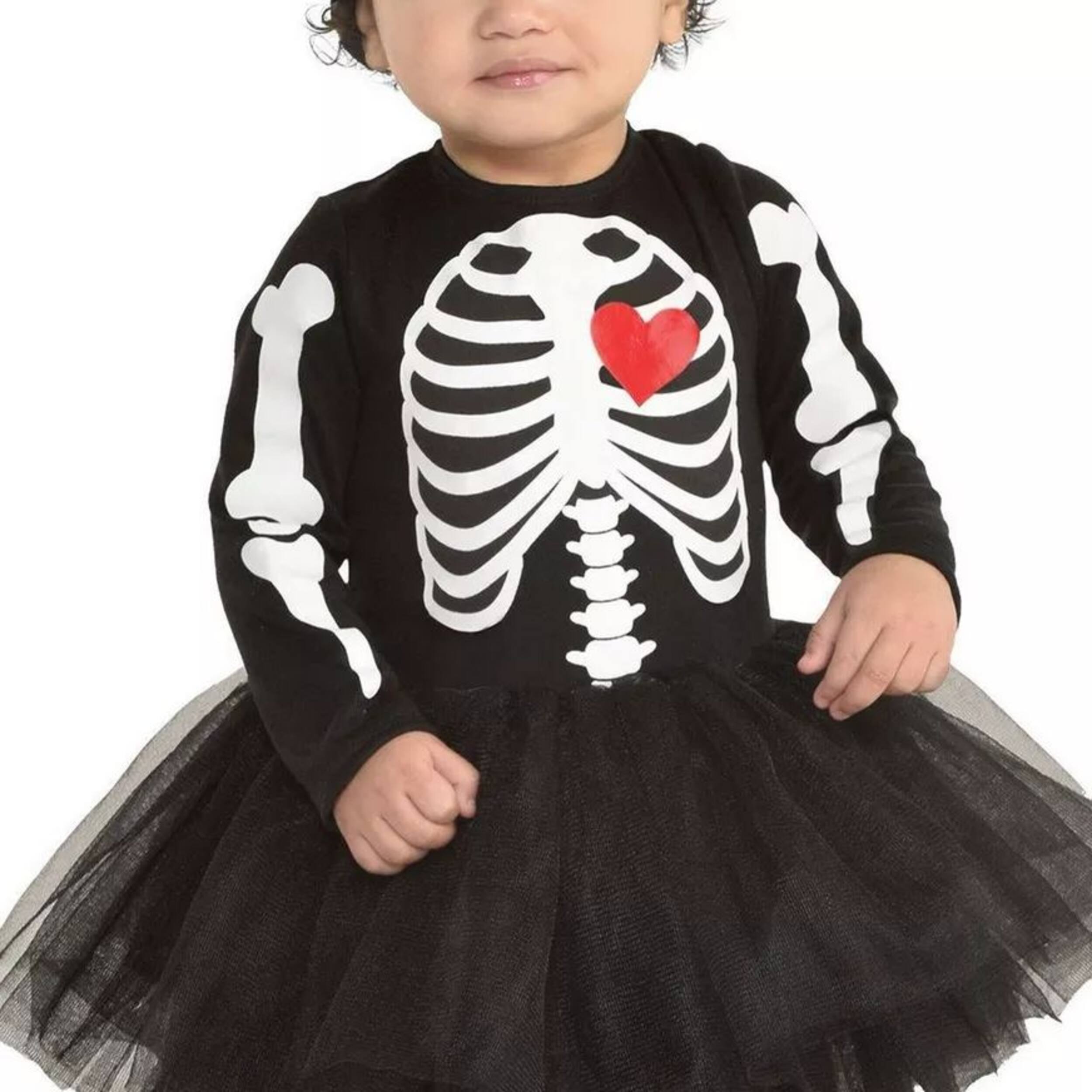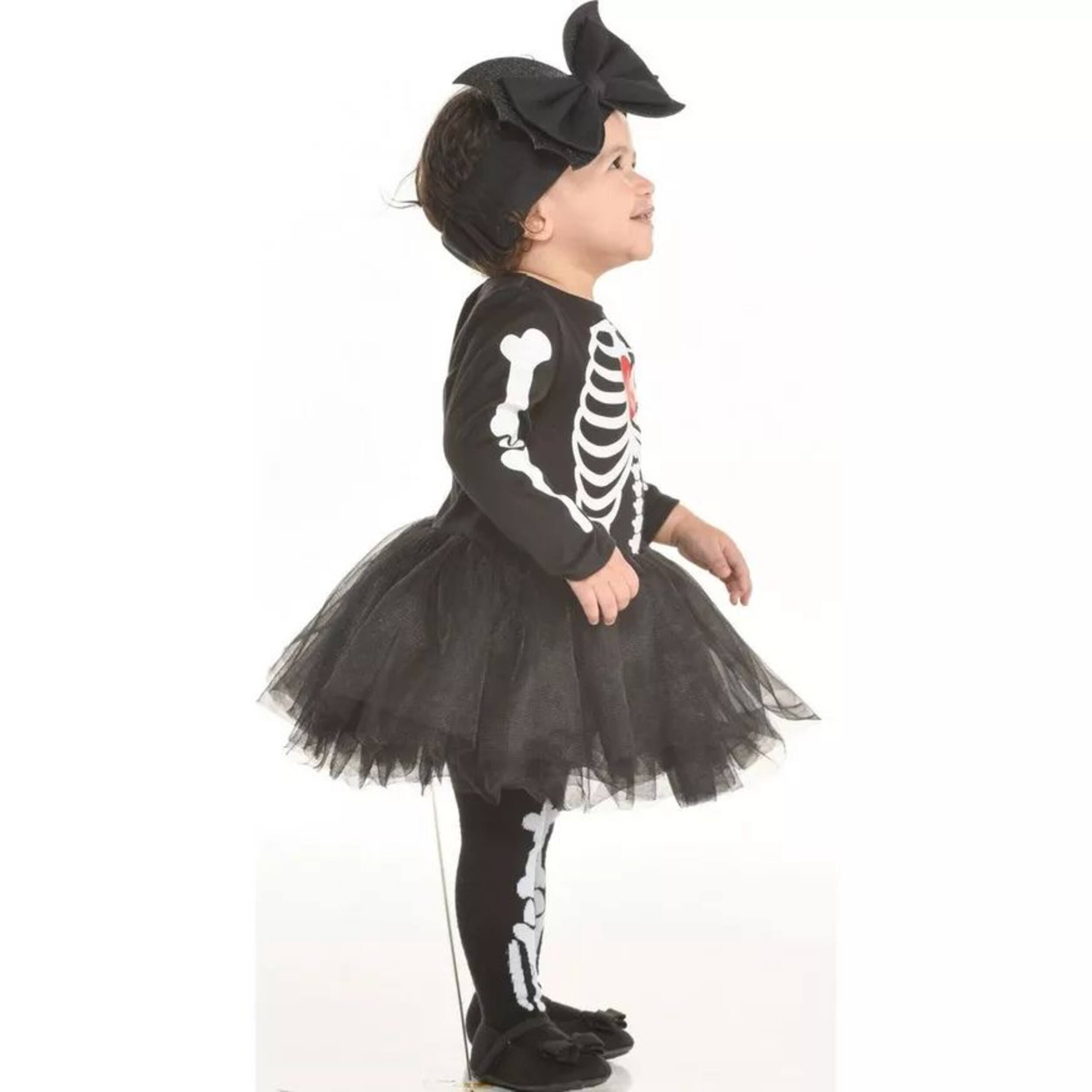 Infant Skeleton Tutu Costume features a bone printed onesie, fluffy tutu, and cute headpiece