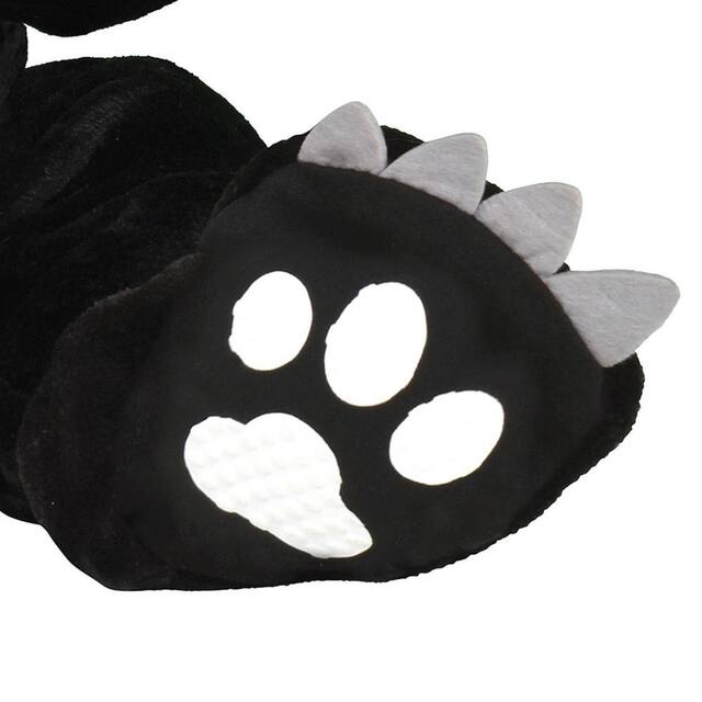 Includes a furry black and white jumpsuit, matching hood with attached ears and a detachable tail and booties