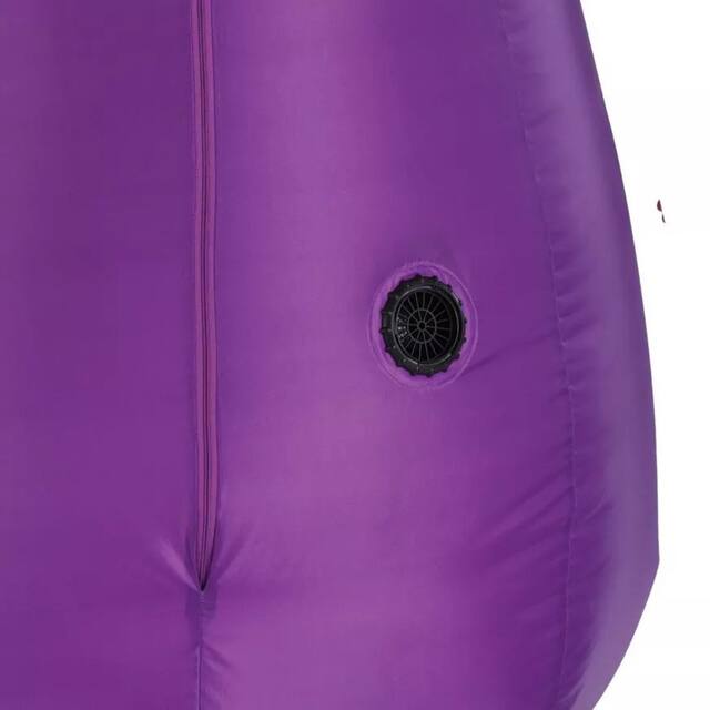 Inflatable eggplant inspired jumpsuit with fan and battery pack