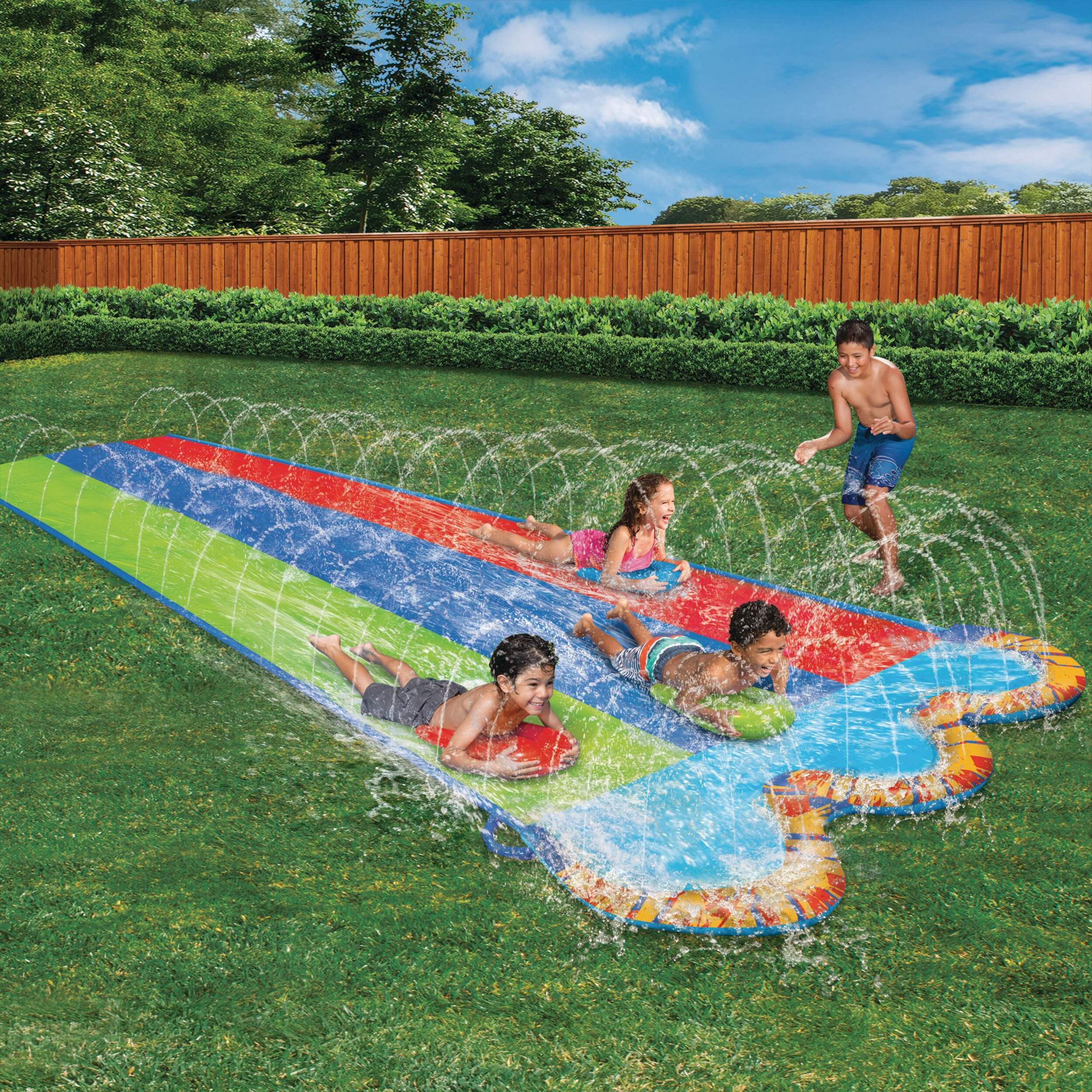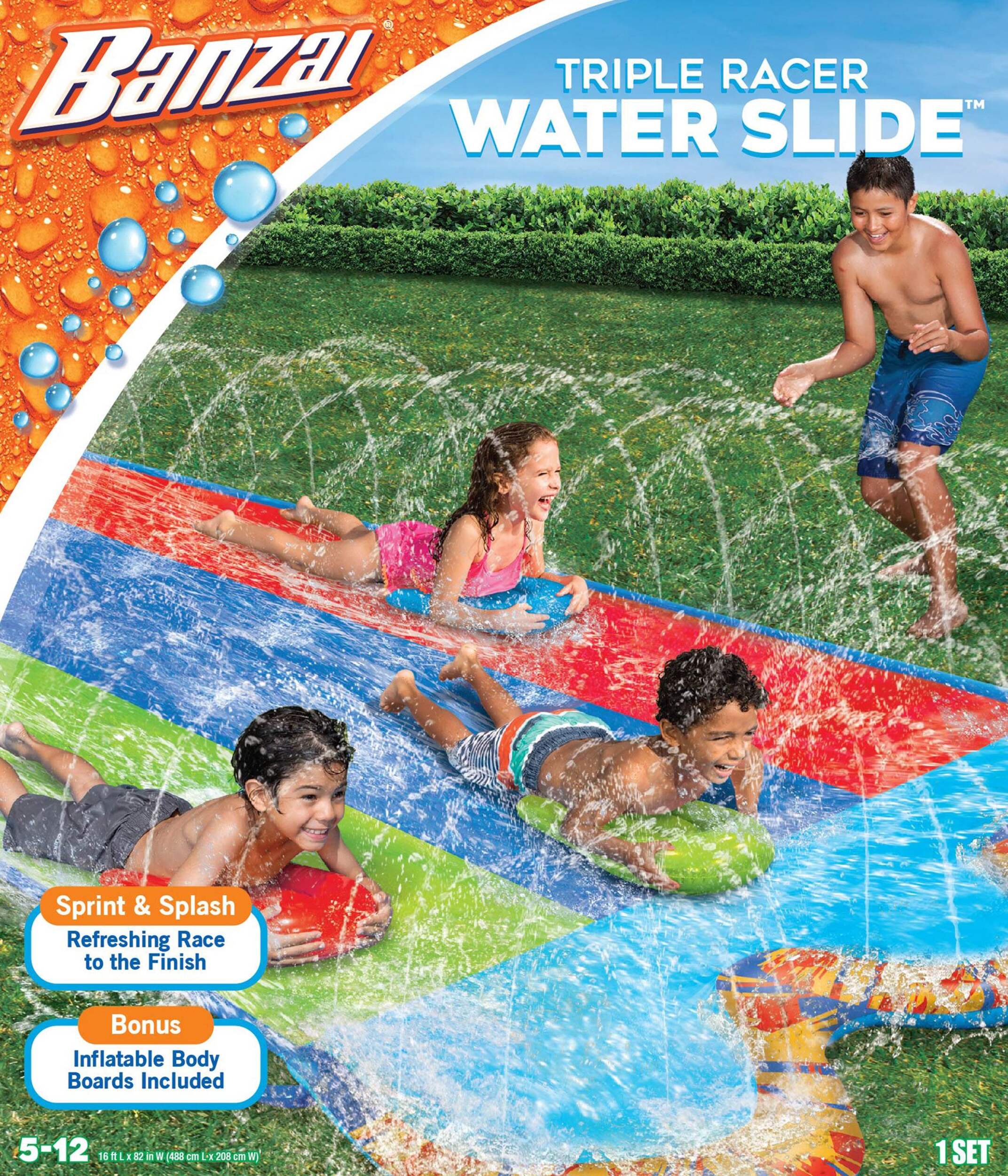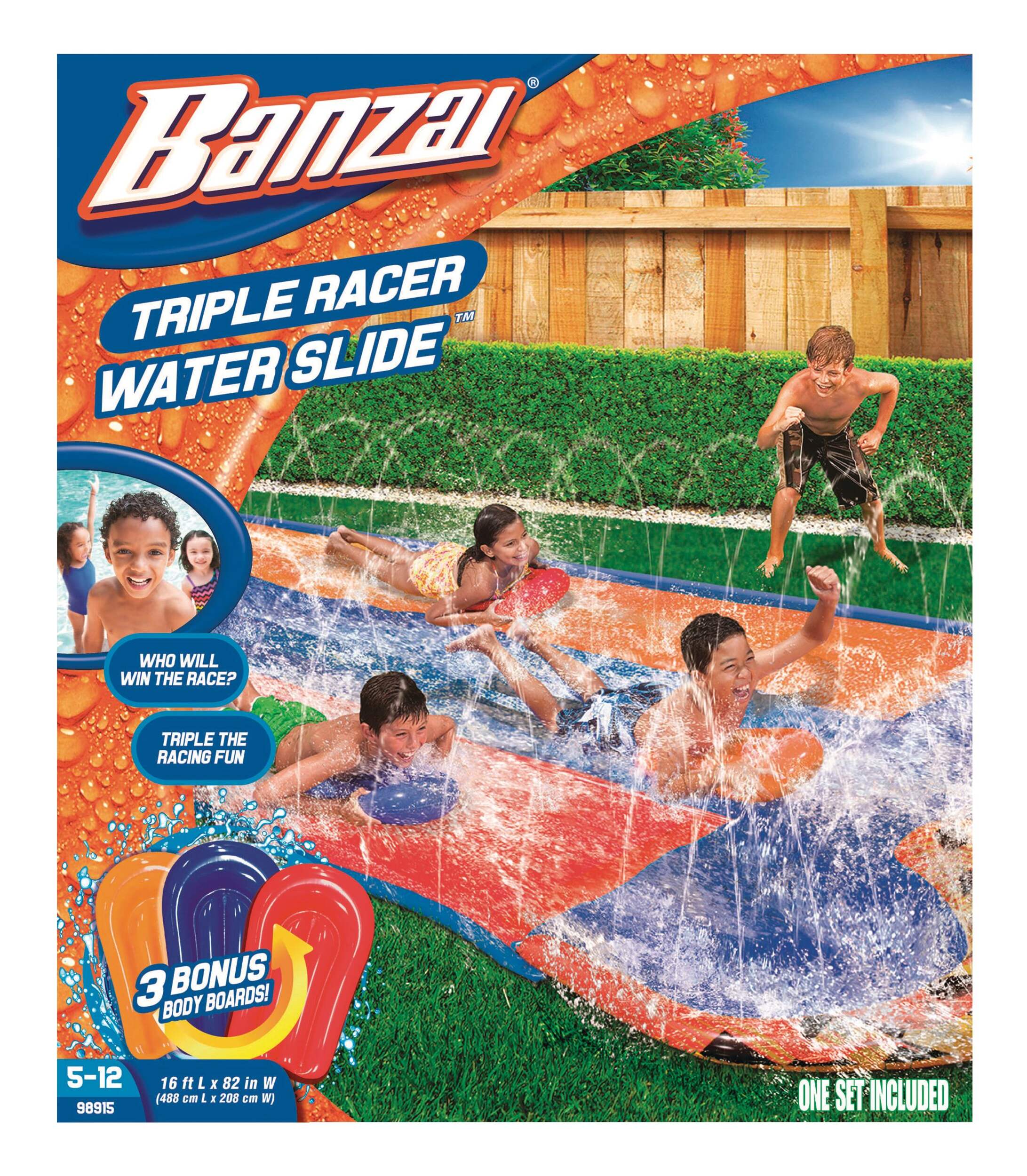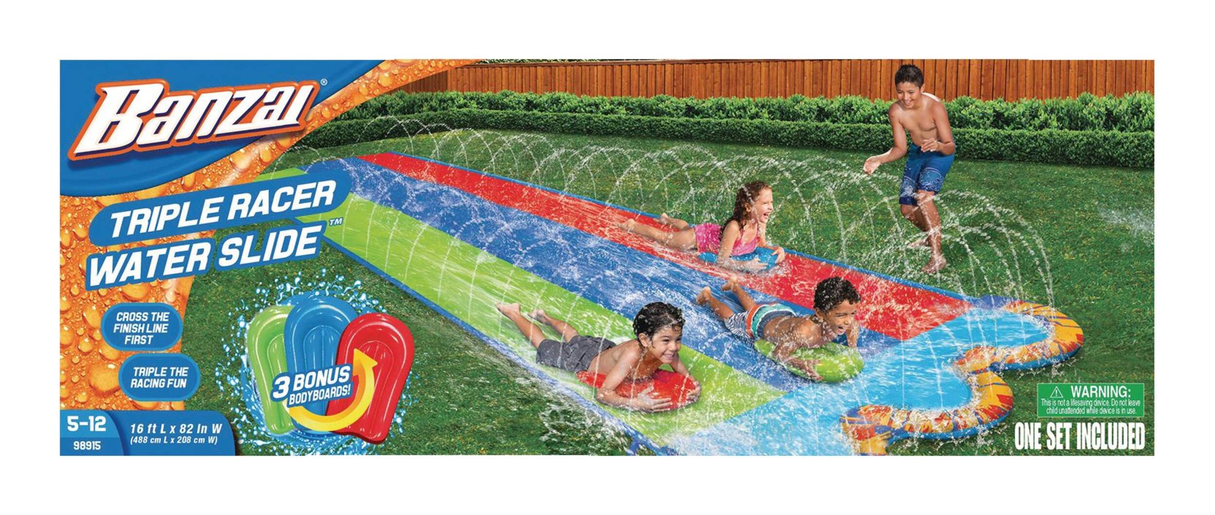 The Banzai Inflatable Triple Racer Water Slide features a fun, three-lane raceway design for endless summer excitement. Suitable for kids aged 5 and up, this water toy includes three bodyboards for sliding action. The dimensions of the slide are 16 feet in length and 82 inches in width, providing ample space for friendly competition. With Banzai's Triple Racer, children can race through the water tunnel and cross the finish line for a thrilling experience.