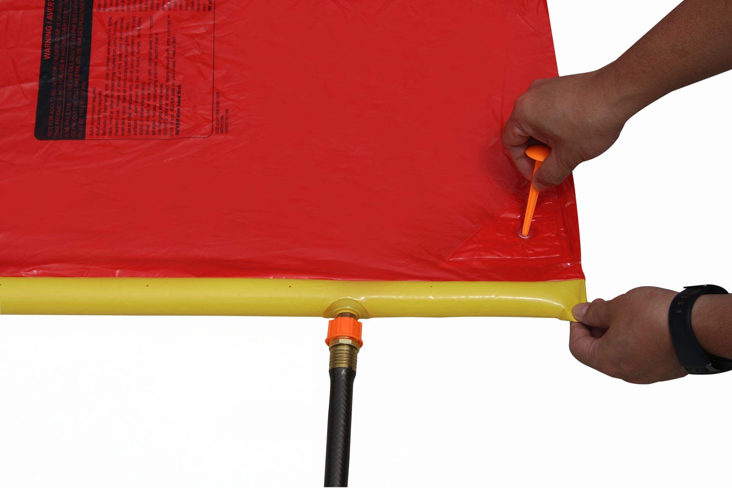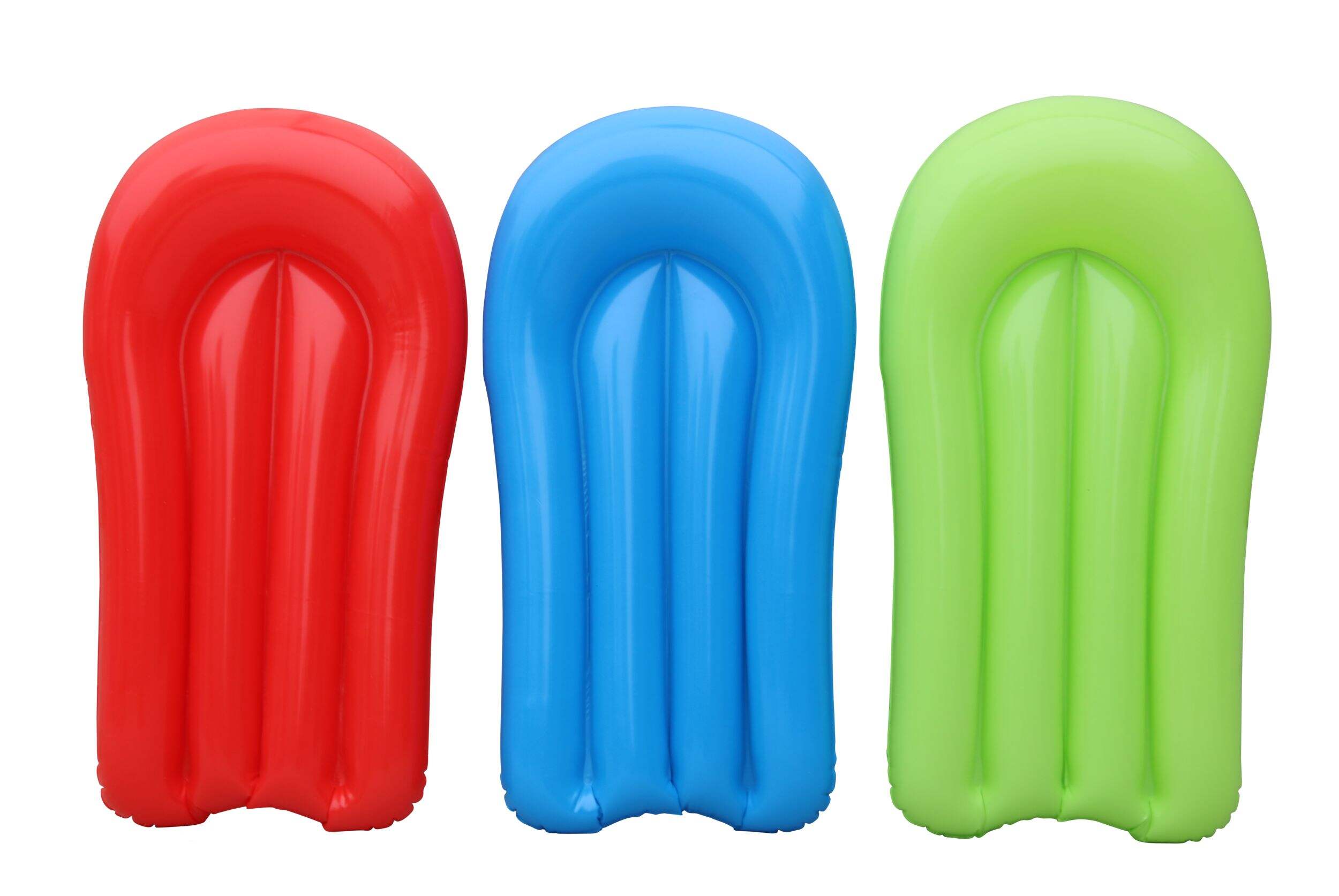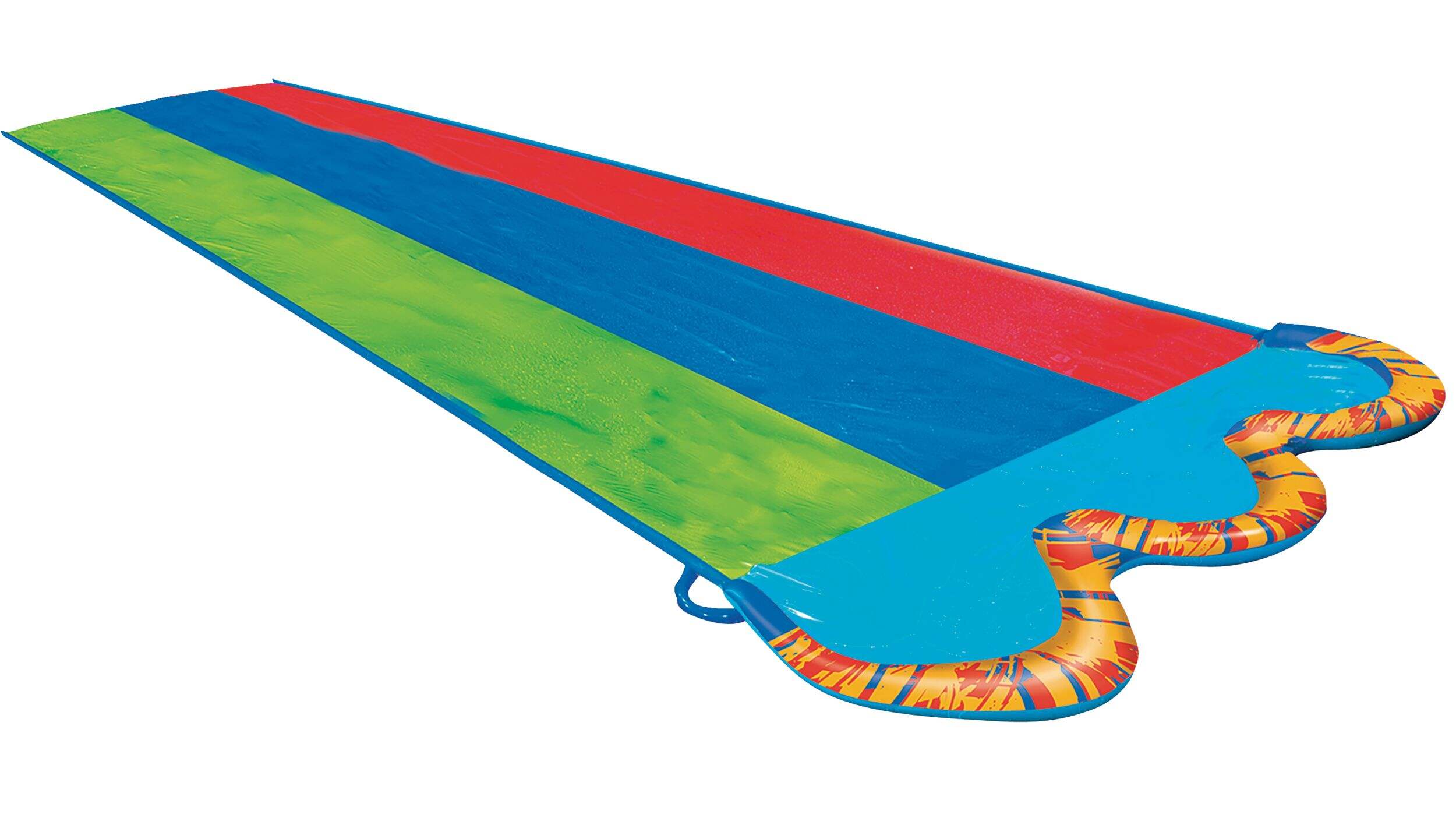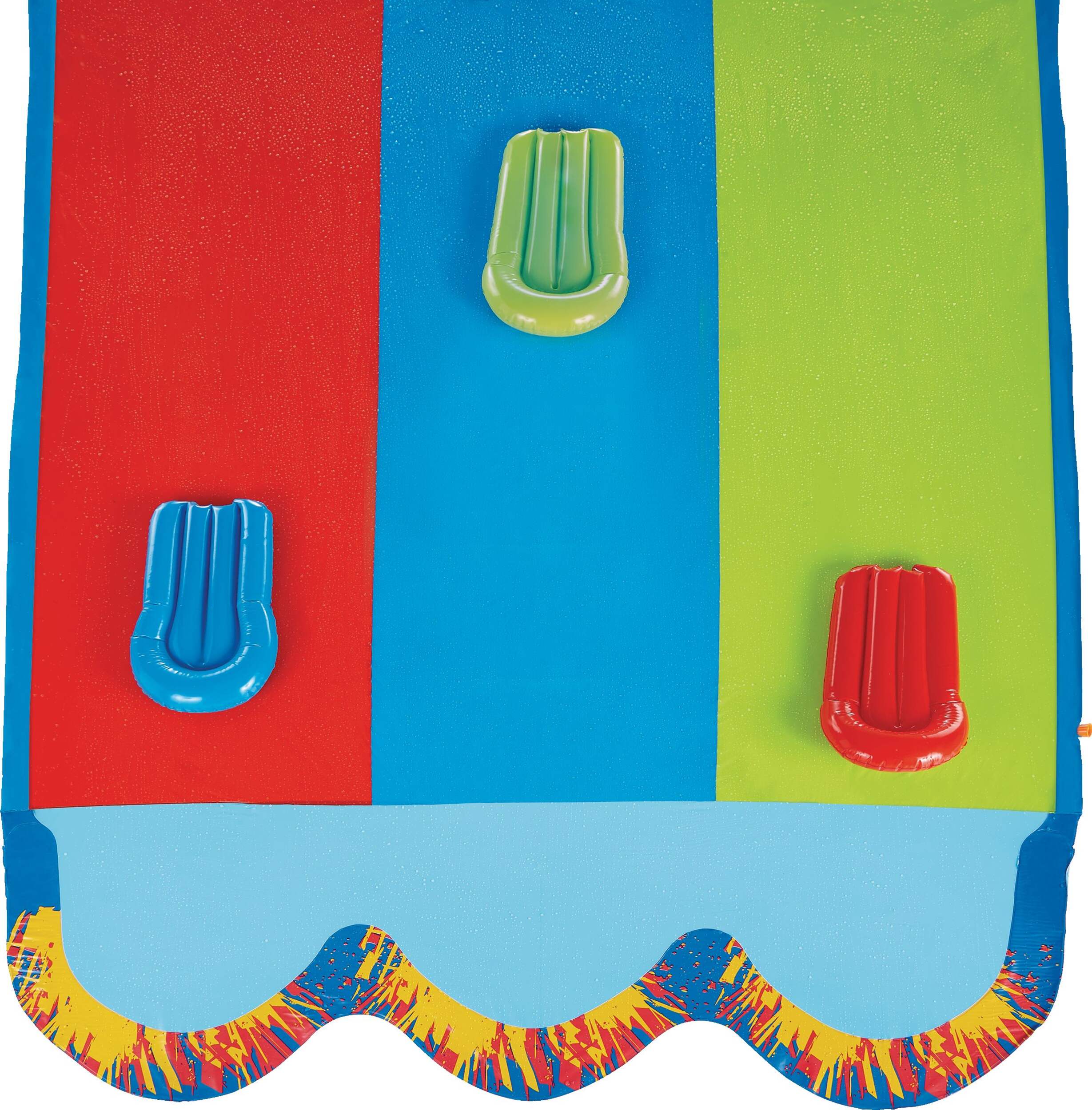 The Banzai Inflatable Triple Racer Water Slide features a fun, three-lane raceway design for endless summer excitement. Suitable for kids aged 5 and up, this water toy includes three bodyboards for sliding action. The dimensions of the slide are 16 feet in length and 82 inches in width, providing ample space for friendly competition. With Banzai's Triple Racer, children can race through the water tunnel and cross the finish line for a thrilling experience.