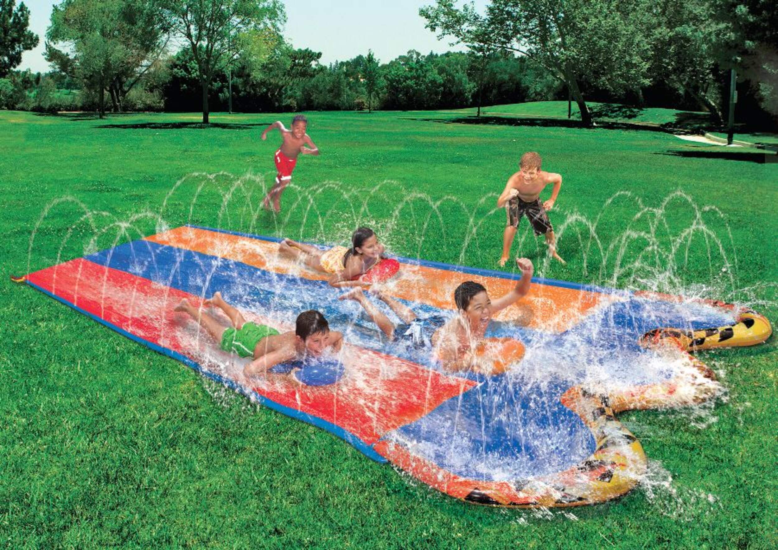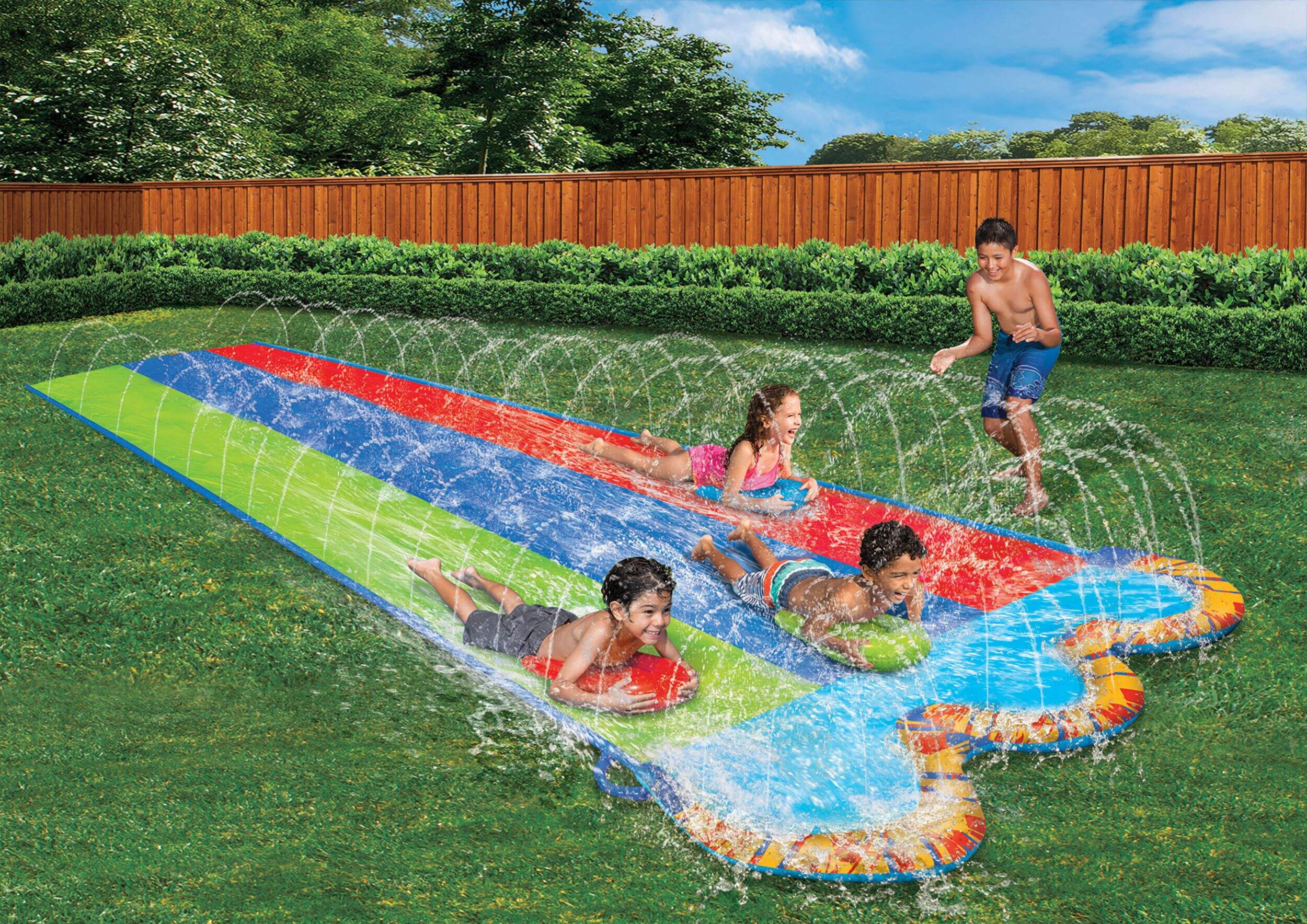 Race through the water tunnel and across the finish like first with the Triple Racer Water Slide