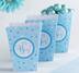 Treat boxes feature the classic popcorn box shape with scalloped edges, blue and white polka dots, and "It's a Boy" headlines