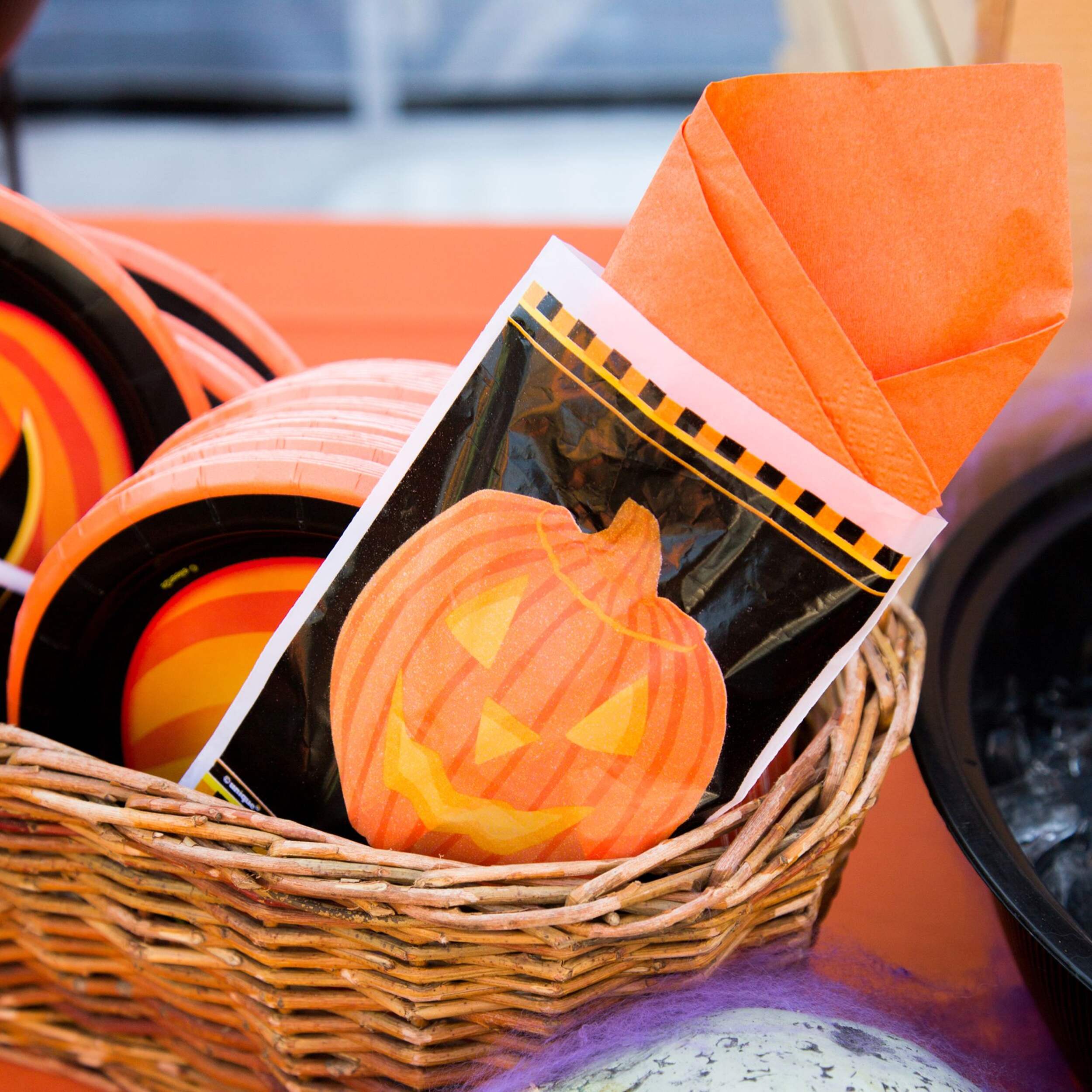 Featuring a smiling jack-o-lantern, these colourful candy bags will make a fun addition to your child's Halloween costume party