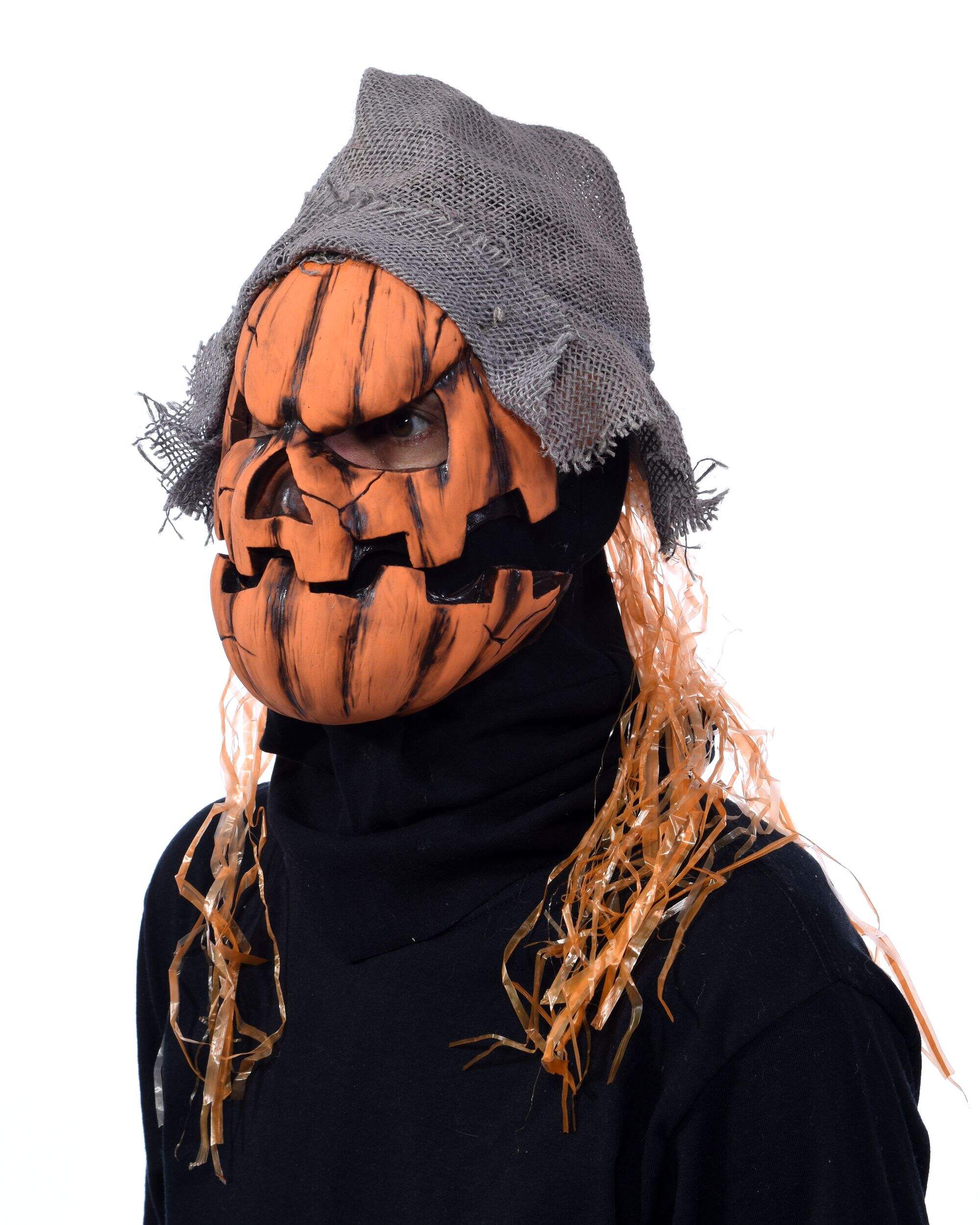 Transform into a terrifying character this Halloween with the Jack-O'-Lantern Smashed Pumpkin Mask with Hat. This unique accessory features an original sculpt and a moving mouth, ensuring you stand out at any spooky event. Perfect for creating unforgettable scary reactions, this mask is both breathable and lightweight for comfortable wear all night long.
