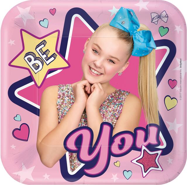 Square paper plates feature a picture of JoJo Siwa wearing one of her trademark big bows printed against a pink background