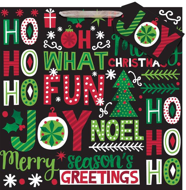 You may be interested in these similar products shown below.Joyful Holiday Christmas Gift Bag is made of durable black paper and has white ribbon handles