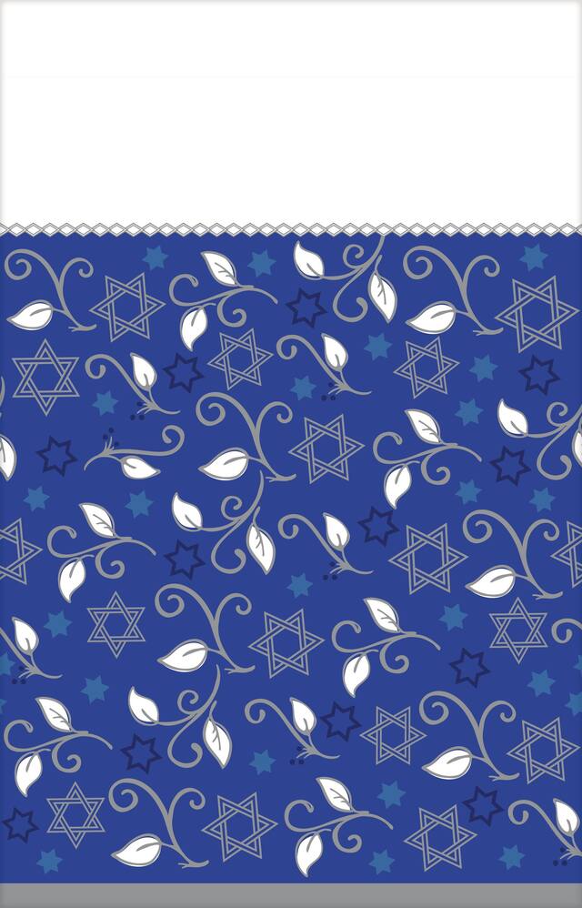 Plastic table cover features silver and white leaf along with Star of David designs