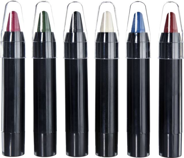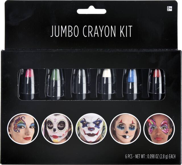 You may be interested in these similar products shown below.Complete your DIY Halloween look with the Jumbo Retractable Crayon Halloween Makeup Sticks, 6-pk. These 6-pack makeup sticks feature various colours to lift your Halloween costume. It instantly makes you look more vibrant and party-ready. These makeup sticks are designed just like crayons and include black, blue, green, pink, and white colours. Simply draw any design you'd like on your face and accessorize accordingly. Made for lasting use, each stick measures 4 1/2 inches in length.