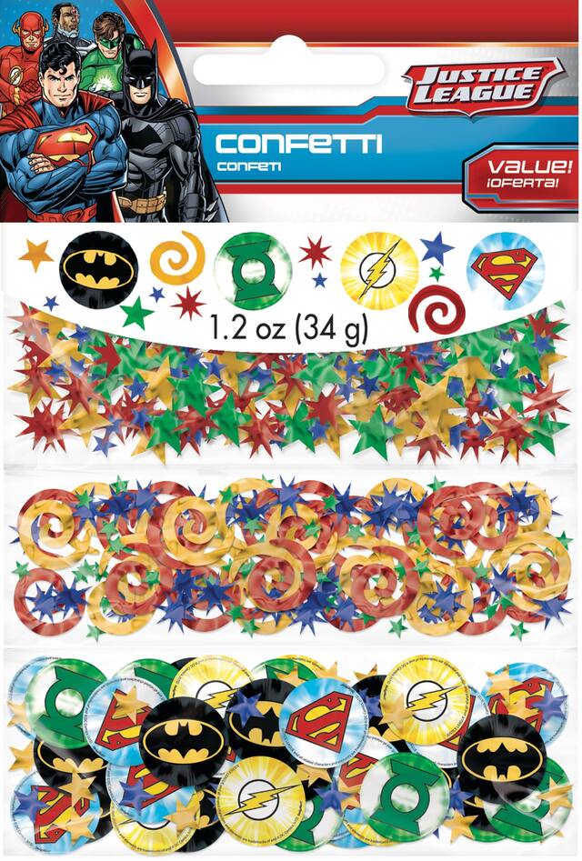 • Justice League Birthday Confetti features vibrant and shiny swirls and stars
