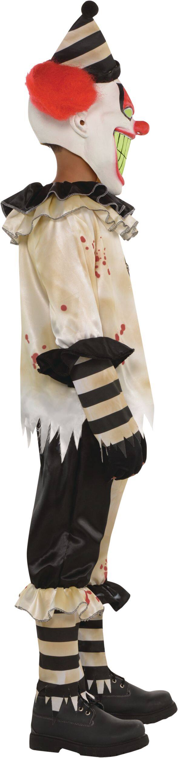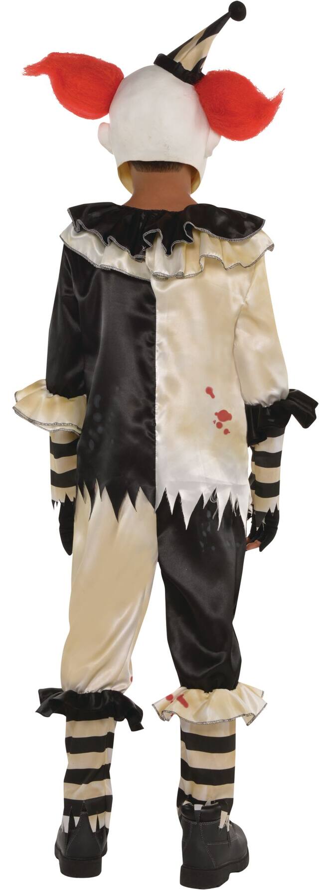 You may be interested in these similar products shown below.Kids' Glow-in-the-Dark Carnival Nightmare Clown Costume features a black and white shirt with an attached double ruffle collar and long black and white sleeves with stripes and ruffles