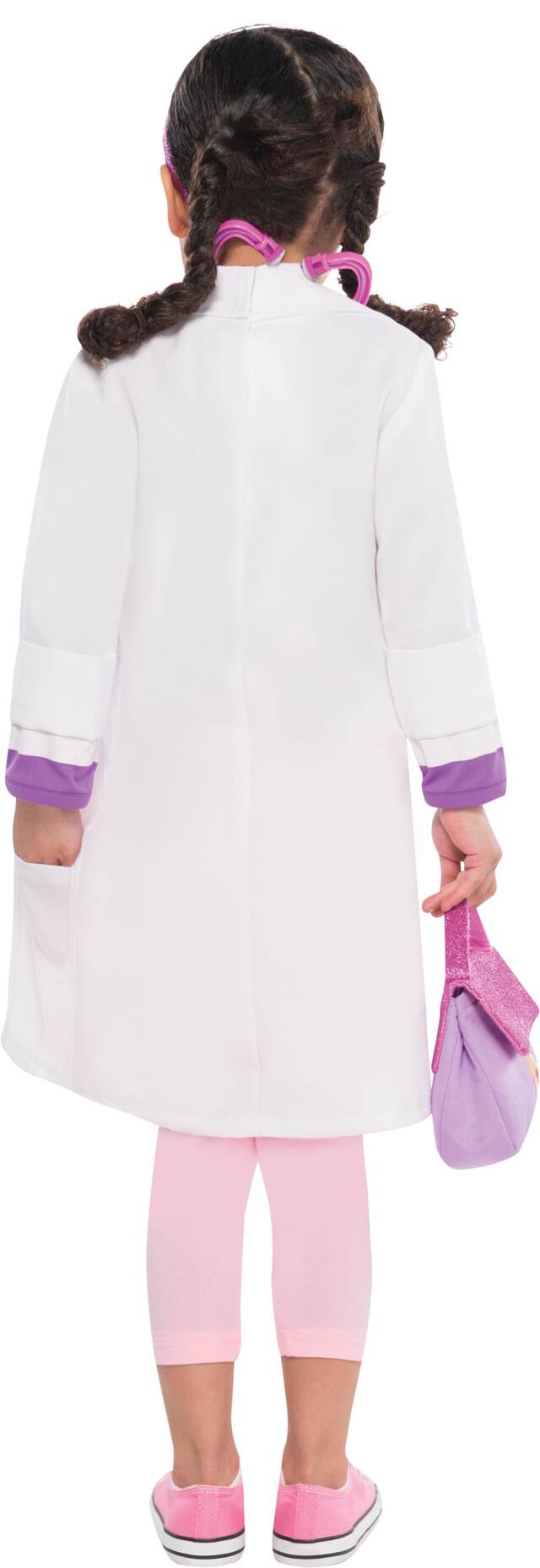 Girls Doc McStuffins Costume features a dress with a purple and white striped top and pink skirt