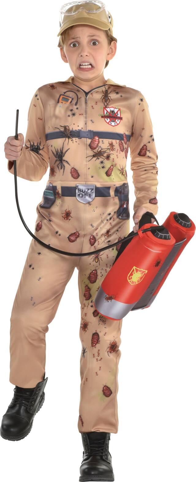 Includes a brown jumpsuit with attached bugs, a brown hat, goggles, and a backpack sprayer to have your child looking like a bug exterminator