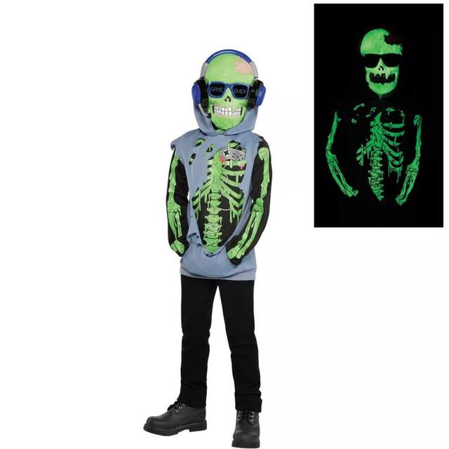Transform your child into a fierce zombie gamer this Halloween with the Kids' Gamer Zombie Green/Black Glow-in-the-Dark Outfit. This costume includes a glow-in-the-dark hoodie and mask, perfect for making a spooky statement. Available in various sizes, it ensures a great fit for every young ghoul.