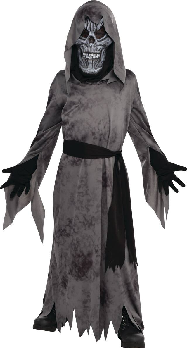 Child Ghastly Ghoul Costume features a grey hooded robe with extra-long sleeves and a jagged hem