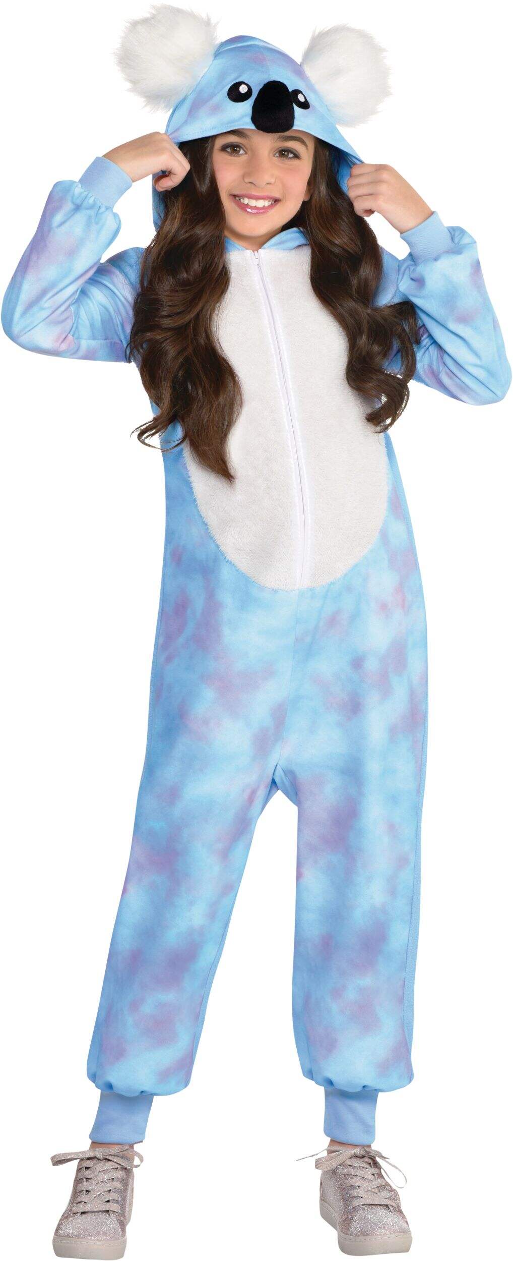 The Zipster Koala One-Piece Costume is a blue and purple jumpsuit that features an adorable koala face hood with fuzzy ears, a soft plush belly, and elastic wrist and ankle openings for quick and easy dressing. Kids can simply zip up for Halloween or other costume parties, or curl up on the couch in this cuddly outfit.