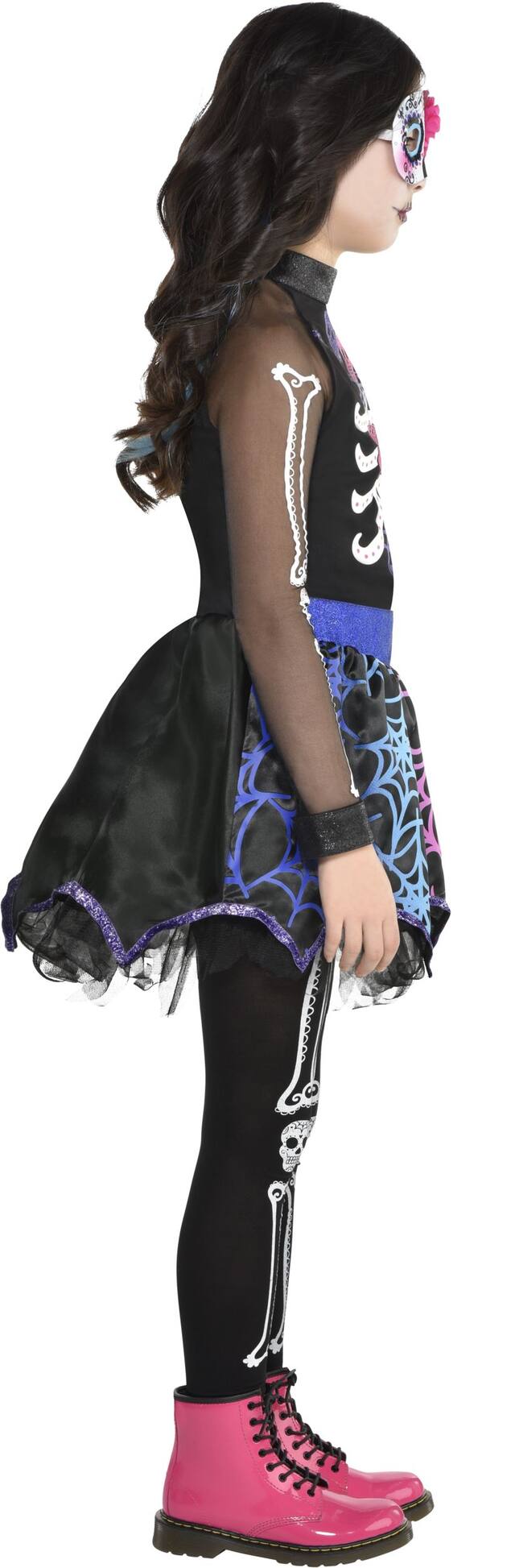 You may be interested in these similar products shown below.Child Trendy Day of the Dead Costume features a rib cage design on the front and a skirt covered in a colourful spider web pattern