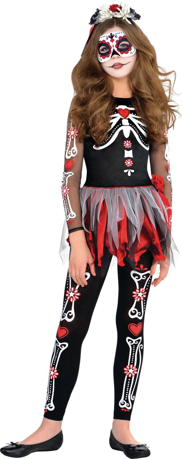 You may be interested in these similar products shown below.Girls Scared to the Bone Costume features a fun tutu dress and footless leggings with bones, flowers and hearts