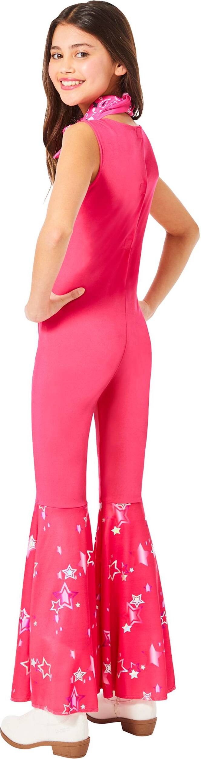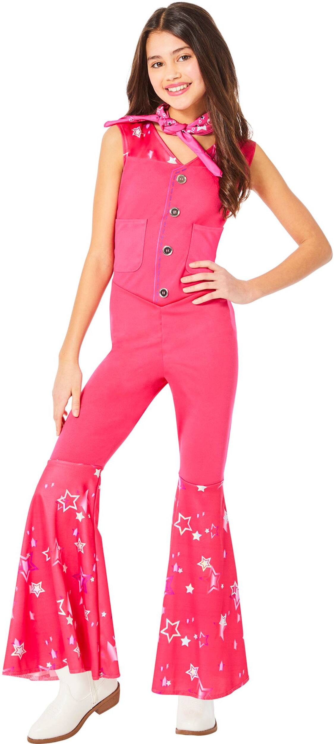 Transform into a real-life Barbie this Halloween with the Kids' Mattel Barbie Movie Pink & Star Cowgirl Jumpsuit & Bandana Costume. This vibrant pink outfit, inspired by the Barbie movie, includes a stylish cowgirl jumpsuit and a matching bandana. Perfect for young fans who want to embody the iconic character and stand out at any costume event.