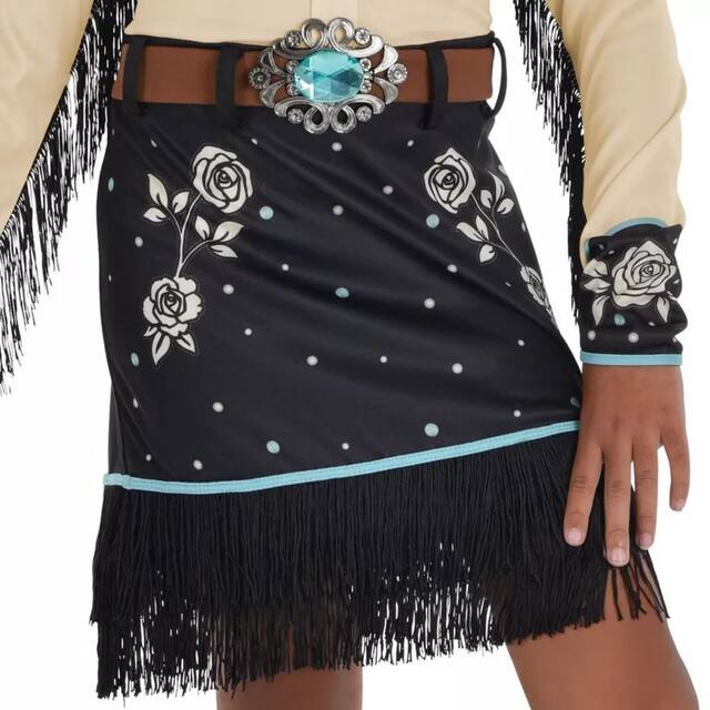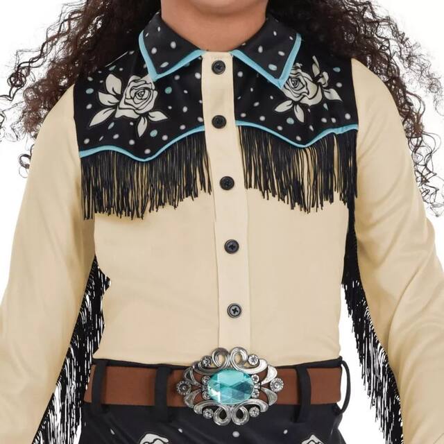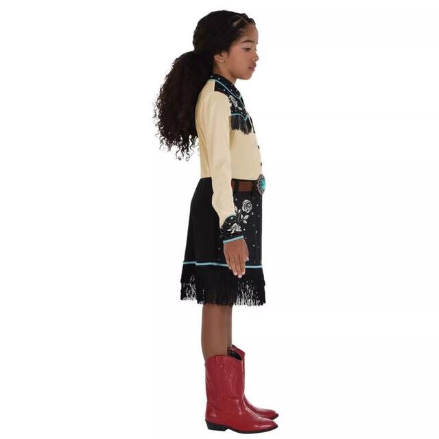 Transform your child into a charming cowgirl with the Kids' Modern Western Dress Halloween Costume. This delightful cowgirl costume features intricate western printings and fringe details, perfect for a fun and festive look. The attached gemstone belt adds a touch of sparkle, making it an ideal choice for Halloween or any dress-up occasion.