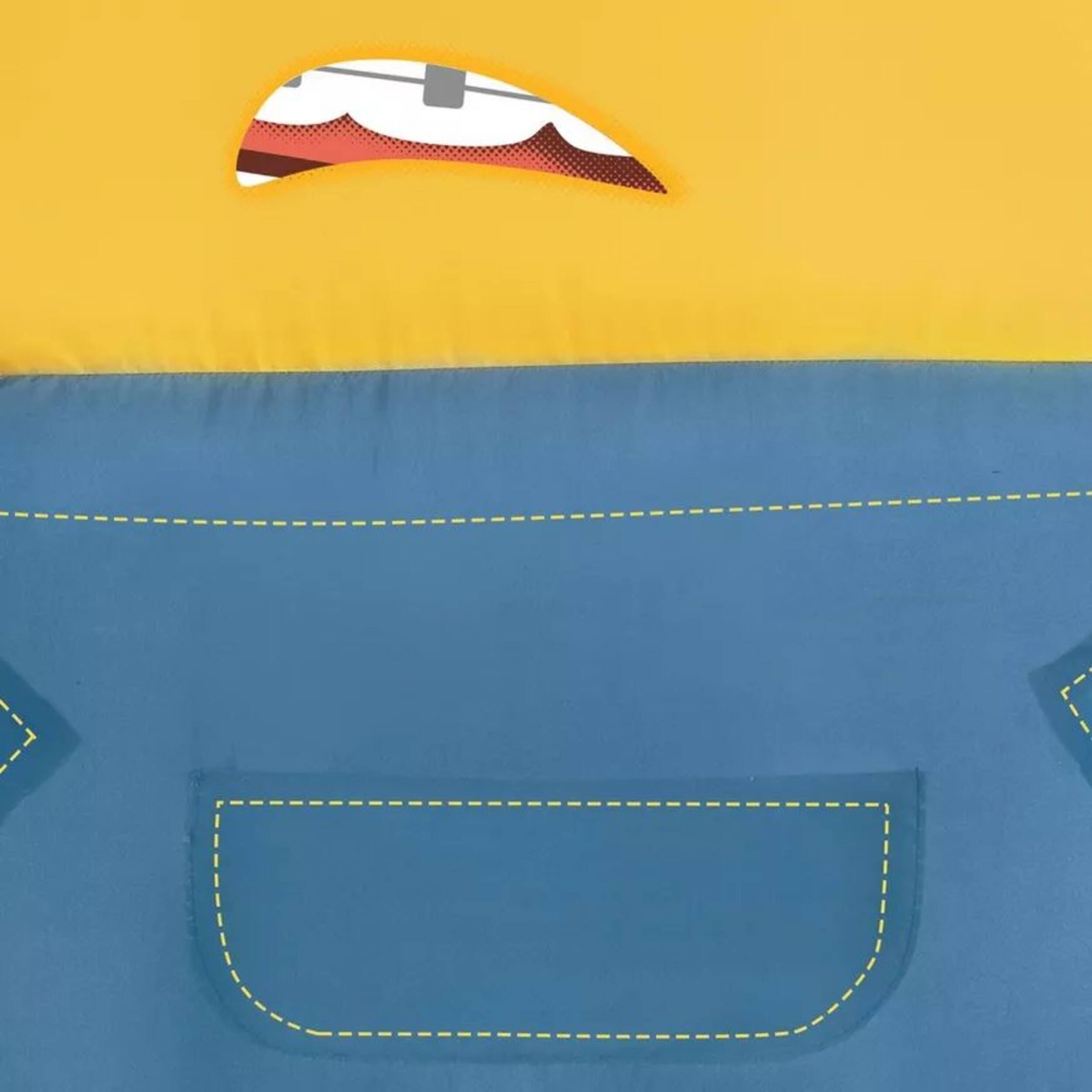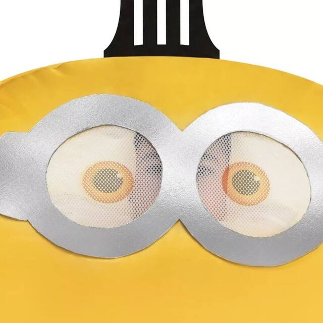 The costume inflates with the attached fan to achieve a full Minion shape, and the big mesh eyes provide wide visibility