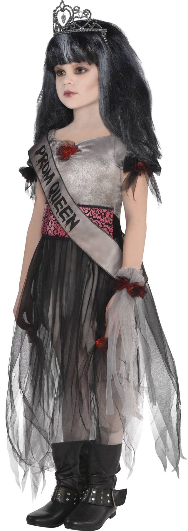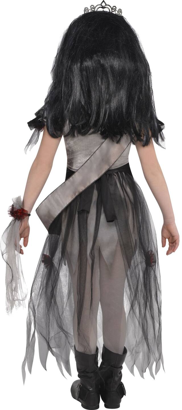 The Kids' Prom Corpse Halloween Costume is perfect for prom nights, Halloween parties, theme parties, and more. The prom corpse costume for girls includes a long grey gown with red rose appliques at the neckline and sleeves. It features a tattered tulle skirt with uneven hems and a removable red brocade print belt. A corsage of red roses and matching grey tulle goes on the wrist, and a tiara and sash crown gives the prom queen look from hell! For a full-on look, the prom queen costume includes a dress, tiara, belt, corsage, and a sash.