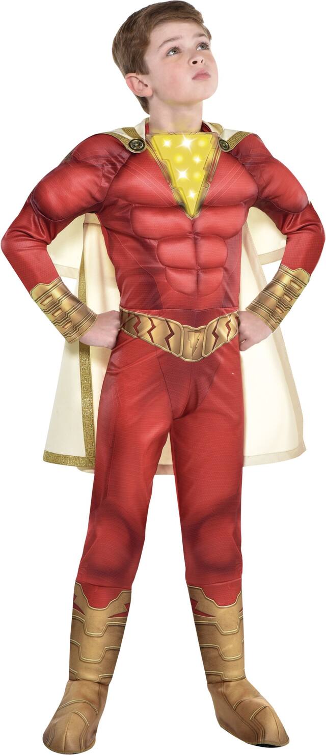 You may be interested in these similar products shown below.Kids' Light-Up Shazam Muscle Costume is designed to make them look just like the superhero with padded muscles in the chest and arms, and gold details for the belt gauntlets and boots