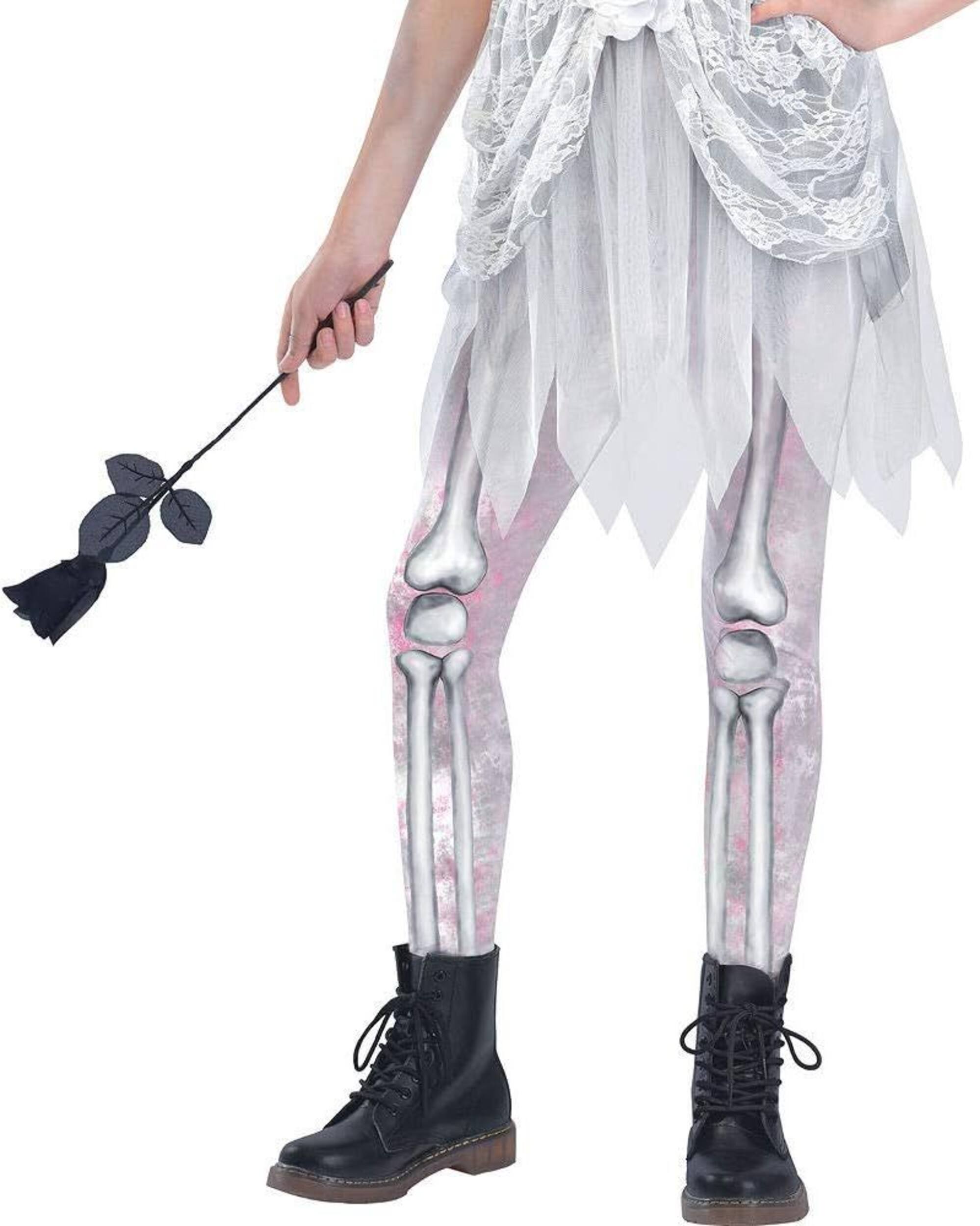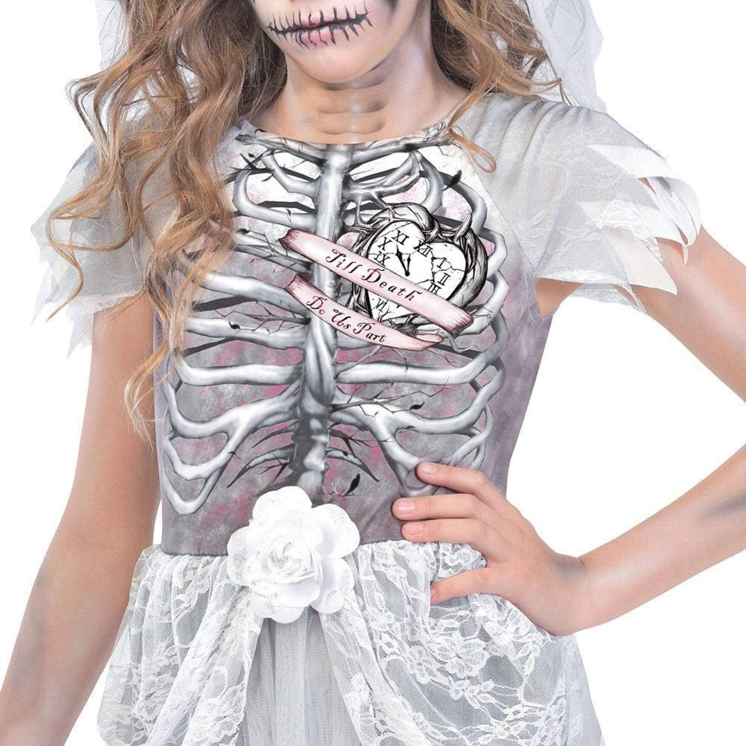 Girls Skeleton Bride Costume features a tattered off-white dress with bone designs