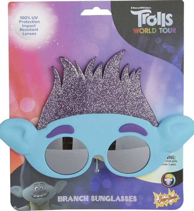 Trolls Child Branch Sunglasses resemble Branch with blue plastic frames that feature his purple eyebrows and ears sticking out the sides