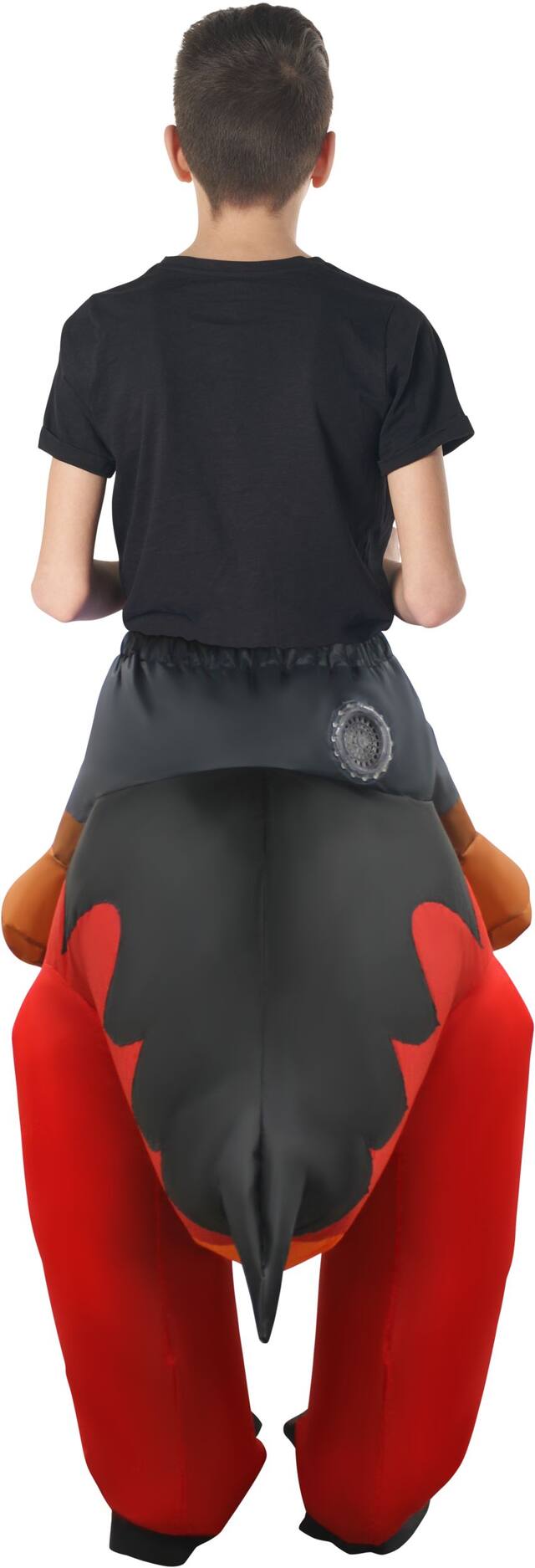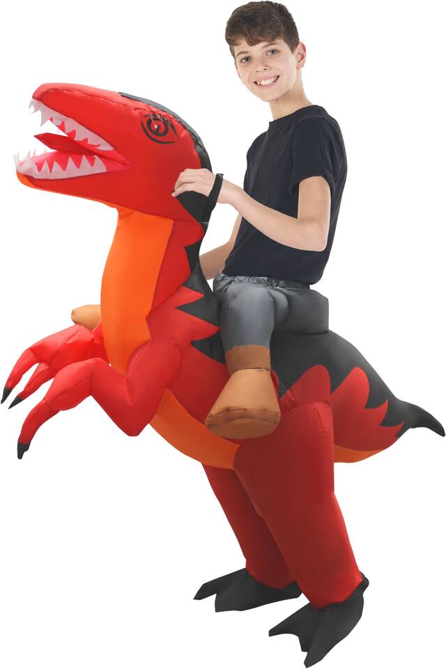 You may be interested in these similar products shown below.This Kids' Velociraptor Dinosaur Red Inflatable Halloween Costume from Amscan transforms kids into ferocious raptors with a battery-operated fan. This inflatable costume features a rear zipper and hook-and-loop closure for your child's comfort. Shoes and shirt not included.