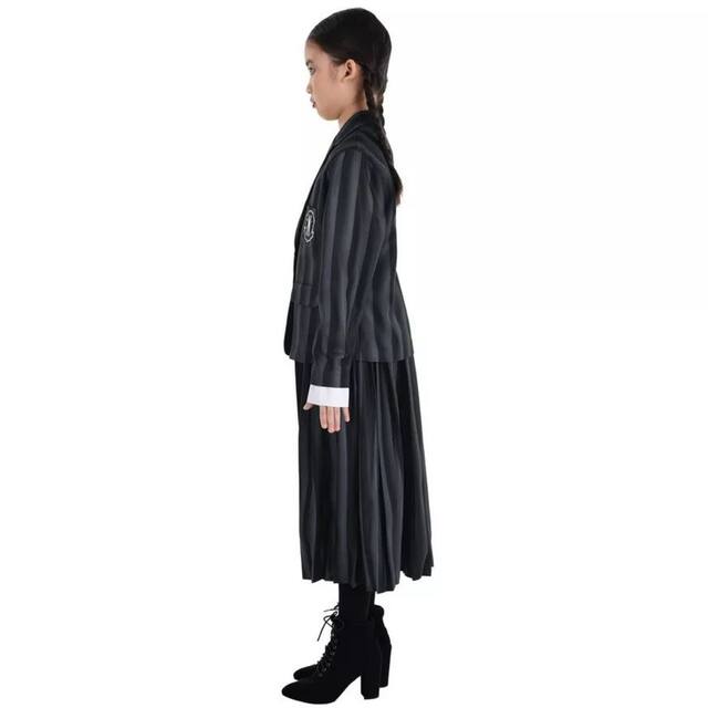 Transform your child into a student of Nevermore Academy with this Kids' Wednesday School Uniform Halloween Costume. Inspired by the popular show 'Wednesday', this student costume includes a costume dress and blazer featuring the iconic Nevermore patch emblem. Perfect for Halloween or themed events, it offers an authentic look that fans will love.