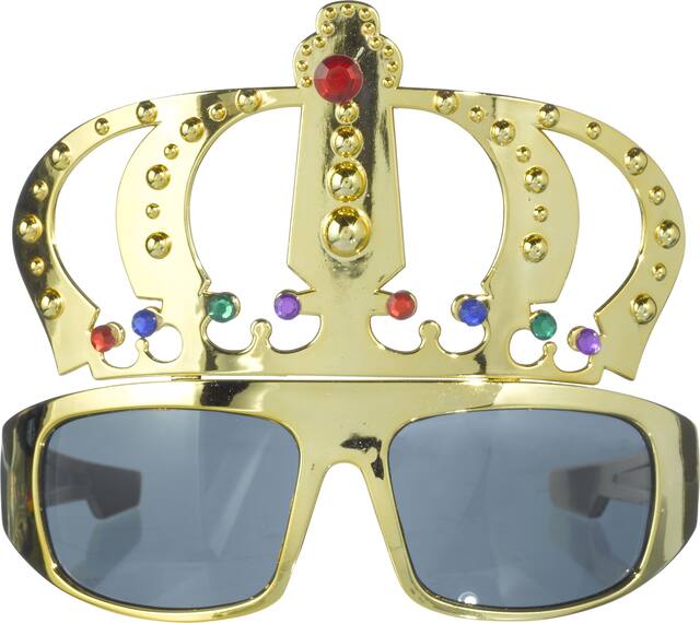Gold sunglasses have an attached plastic crown on the front with faux gem accents