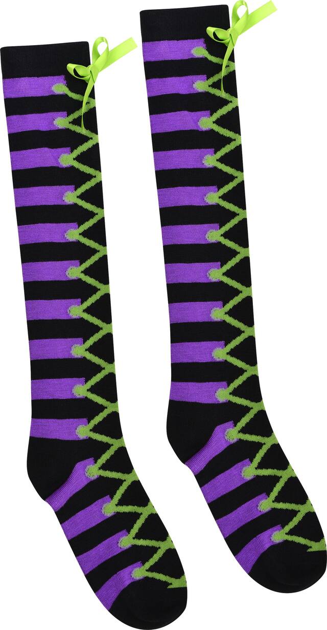 You may be interested in these similar products shown below.Lace-Up Witch Knee-High Socks feature a green lace-up print that stretches from the toes to the knees and are finished with green ribbon bows at the top of the shins
