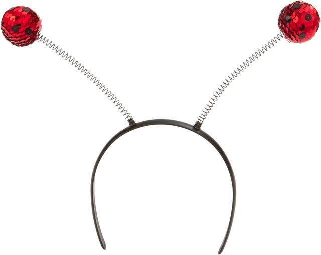 • Bouncy metal springs are attached to a plastic headband with red and black sequin boppers on the top