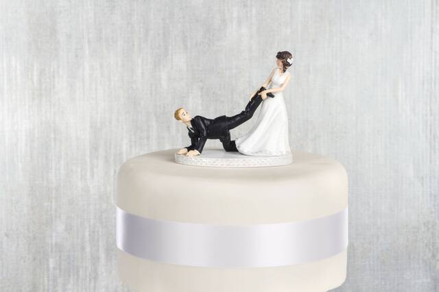 • Leg Puller Bride and Groom Wedding Cake Topper features the bride pulling the groom's leg as he tries to crawl away