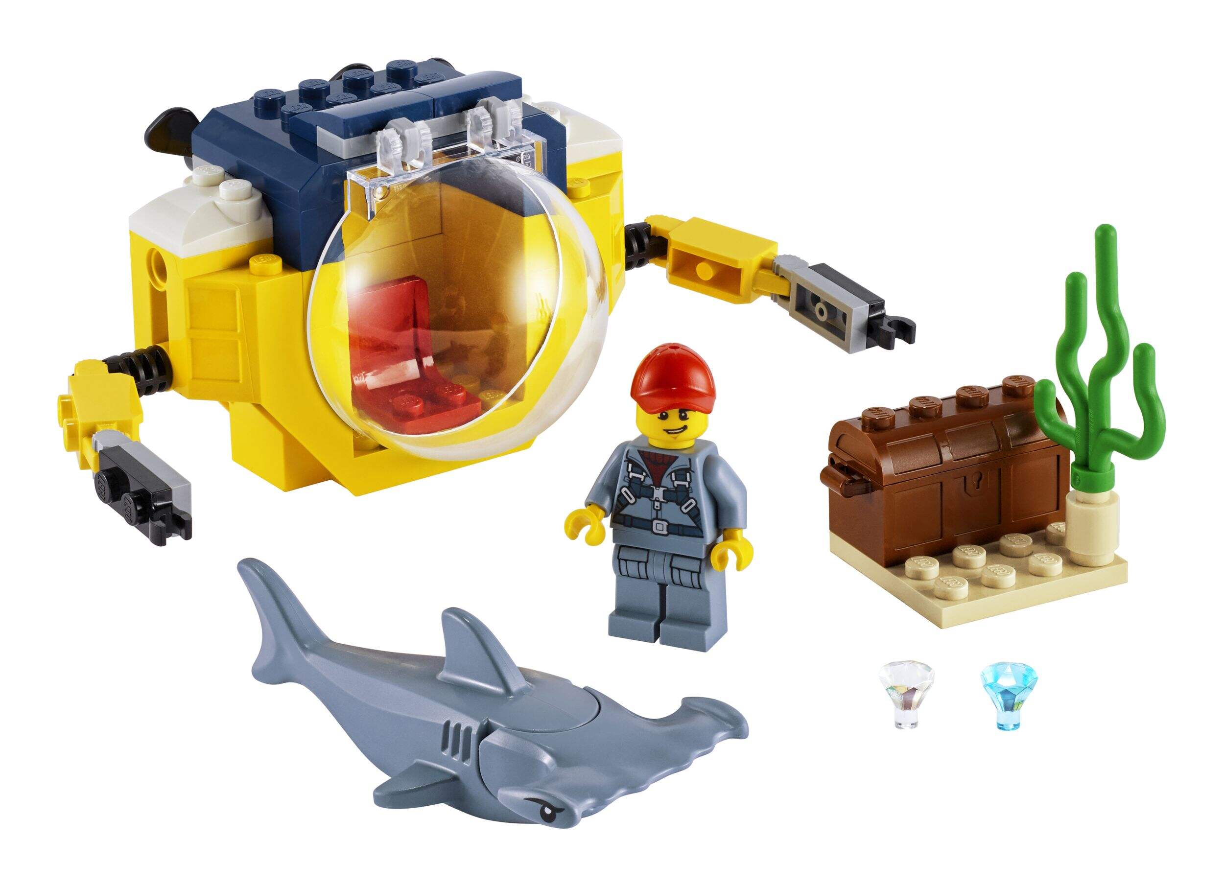 What’s in the box? A cool toy exploration submarine, a seabed setting with pirate treasure chest and gem elements, a pilot minifigure and a hammerhead shark figure. All kids need for imaginary play beneath the waves