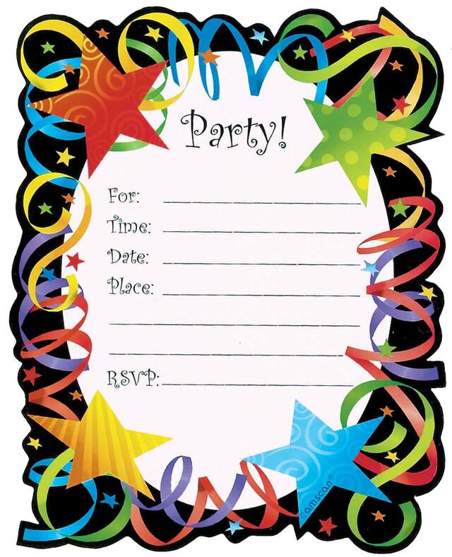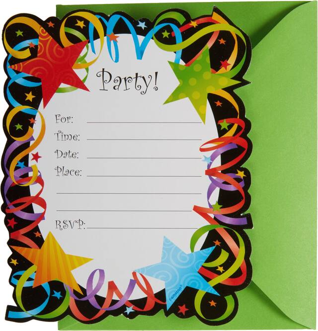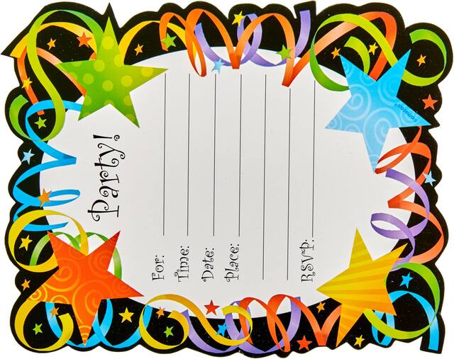 You may be interested in these similar products shown below.Let's Celebrate Invitations feature a die-cut, colourful border of stars and confetti, with a black background and a "Party!" headline in the center white oval