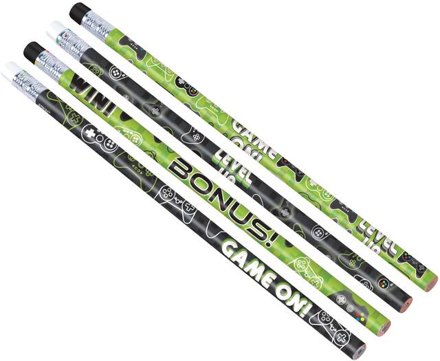 These handy Level Up pencils are perfect for gamers of all kinds.The pack of 8 lead pencils feature pictures of video game controllers and measure a useful 19 cm long with eraser tops. Kids and adults alike will appreciate writing game tips, strategies and to-do lists with pencils that understand the gaming lifestyle. Pop a few in party bags at your next Minecraft, Fortnite or Mario themed gathering, or set up a station with the pencils and paper for guests to sketch their favorite video game characters.
